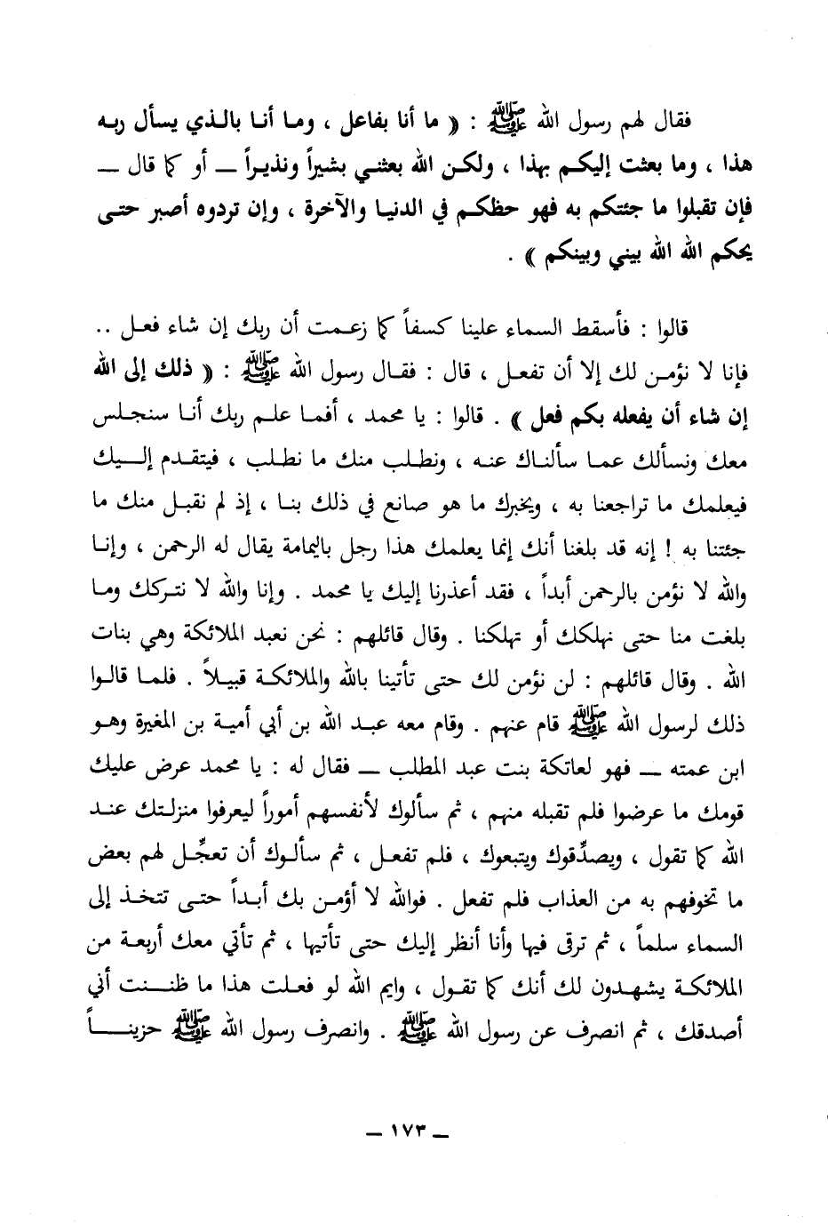 فقال لهم رسول الله (ص): ((ما أنا بفاعل، وما أنا بالذي يسأل ربه هذا، وما بعثت إليكم بهذا، ولكن الله بعثني بشيرا ونذيرا - أو كما قال -فإن تقبلوا ما جئتكم به فهو حظكم في الدنيا والآخرة، وإن تردوه أصبر حتى يحكم الله بيني وبينكم)).