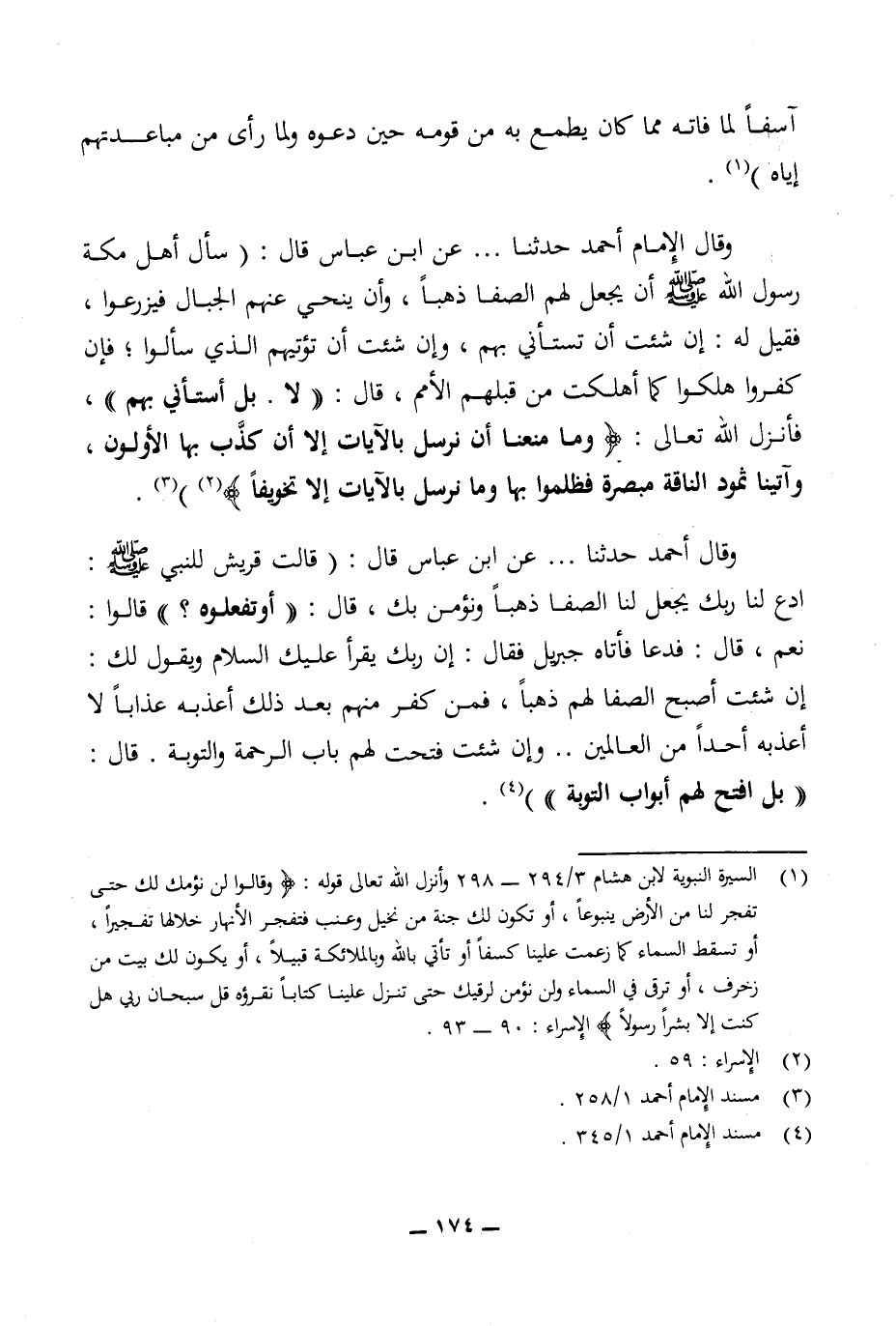 (¬1) السيرة النبوية لابن هشام 294/ 3 - 298 وأنزل الله تعالى قوله: {وقالوا لن نؤمن لك حتى تفجر لنا من الأرض ينبوعا أو تكون لك جنة من نخيل وعنب فتفجر الأنهار خلالها تفجيرا أو تسقط السماء كما زعمت علينا كسفا أو تأتي بالله والملائكة قبيلا أو يكون لك بيت من زخرف، أو ترقى في السماء ولن نؤمن لرقيك حتى تنزل علينا كتابا نقرؤه قل سبحان ربي هل كنت إلا بشر رسولا} الإسراء: 90 - 93.