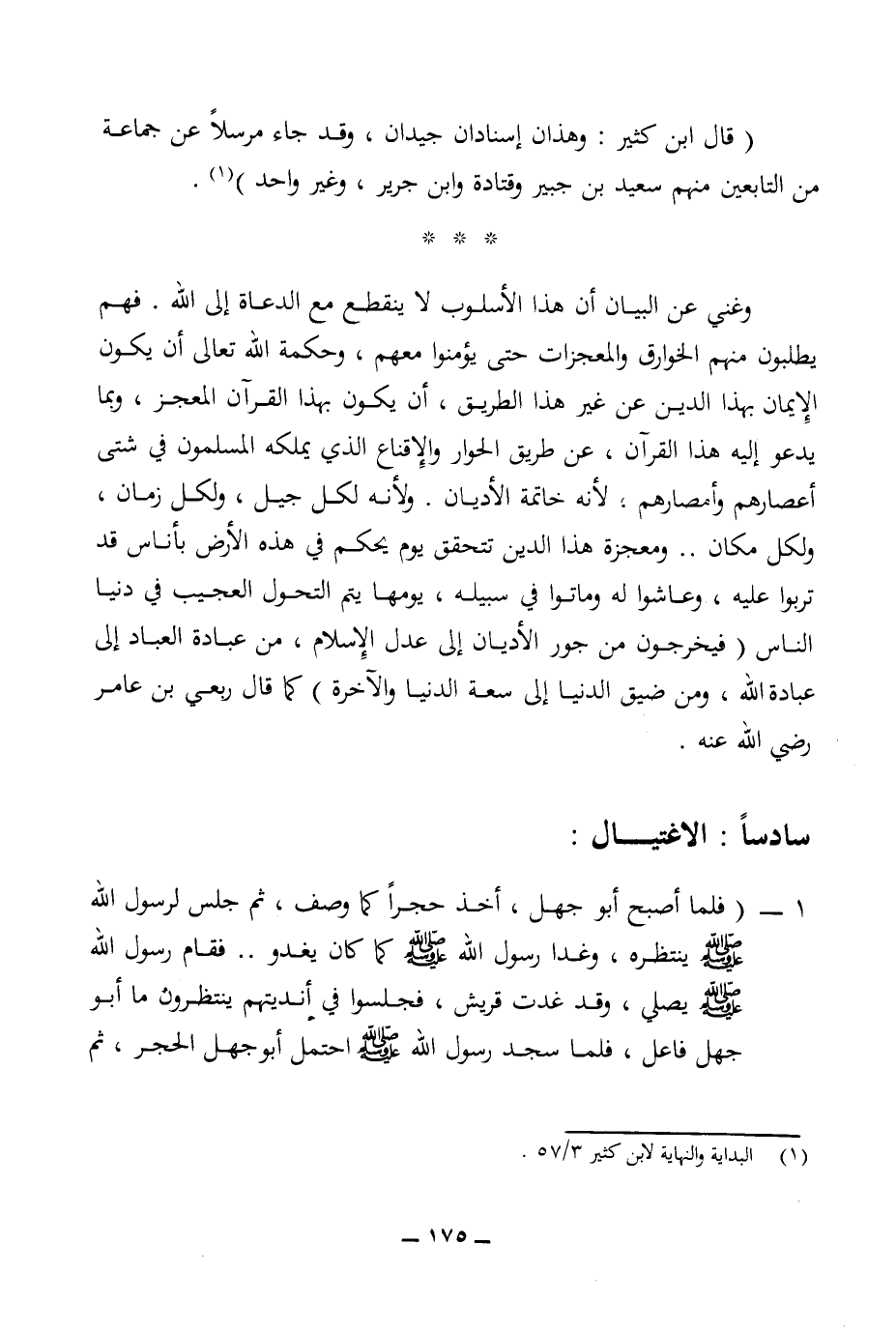1 - (فلما أصبح أبو جهل، أخذ حجرا كما وصف، ثم جلس لرسول الله (ص) ينتظره، وغدا رسول الله (ص) كما كان يغدو .. فقام رسول 1لله (ص) يصلي، وقد غدت قريش، فجلسوا في أنديتهم ينتظرون ما أبو جهل فاعل، فلما سجد رسول الله (ص) احتمل أبو جهل الحجر، ثم