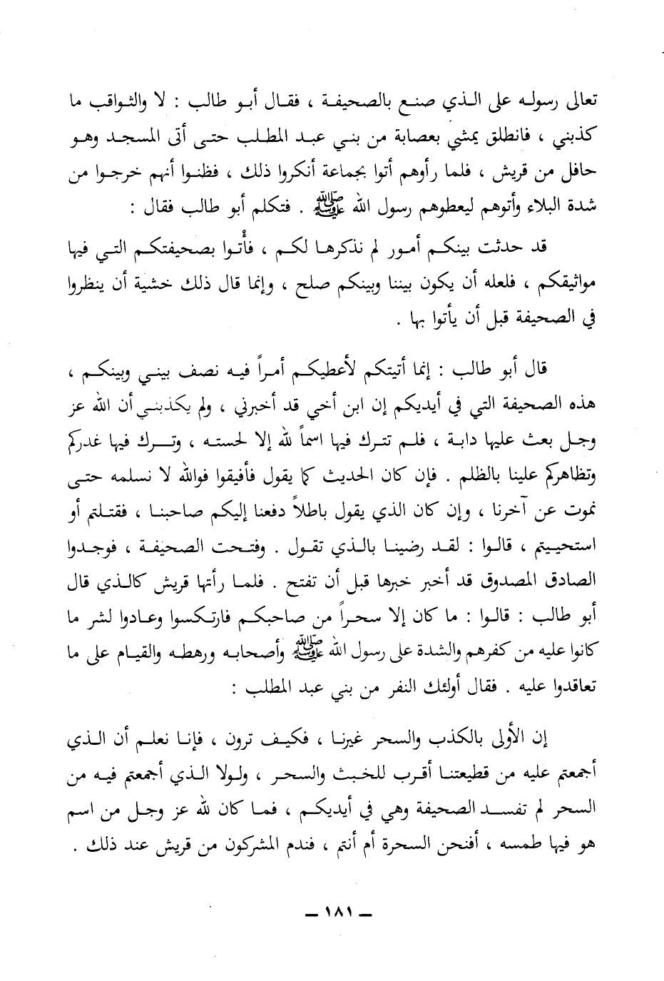 إن الأولى بالكذب والسحر غيرنا، فكيف ترون، فإنا نعلم أن الذي أجمعتم عليه من قطيعتنا أقرب للخبث والسحر، ولولا الذي أجمعتم فيه من السحر لم تفسد الصحيفة وهي في أيديكم، فما كان لله عز وجل من اسم هو فيها طمسه، أفنحن السحرة أم أنتم، فندم المشركون من قريش عند ذلك.