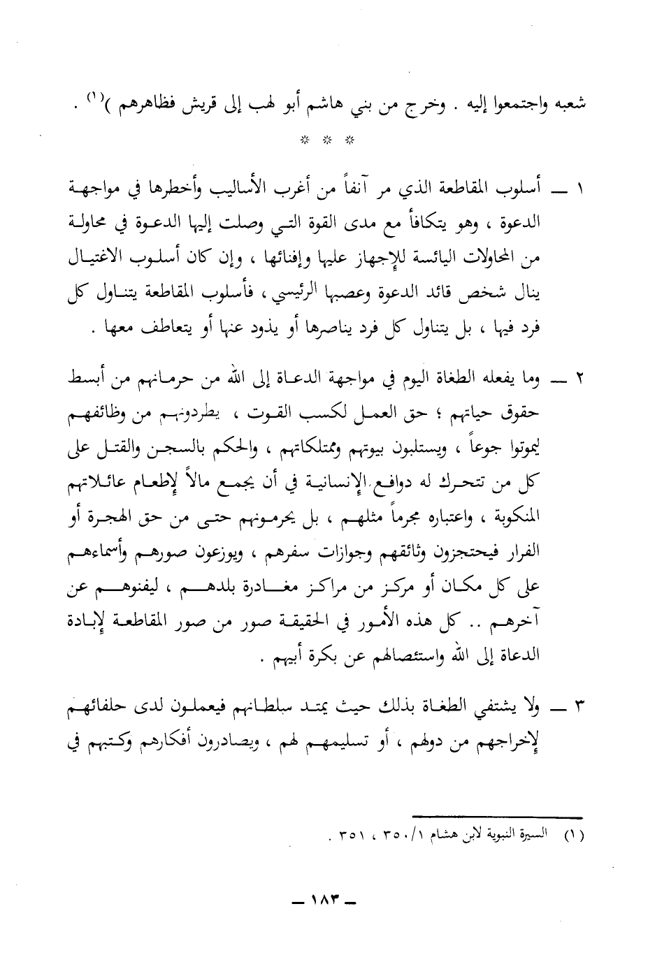 1 - أسلوب المقاطعة الذي مر آنفا من أغرب الأساليب وأخطرها في مواجهة الدعوة، وهو يتكافأ مع مدى القوة التي وصلت إليها الدعوة في محاولة من المحاولات اليائسة للإجهاز عليها وإفنائها، وإن كان أسلوب الاغتيال ينال شخص قائد الدعوة وعصبها الرئيسي، فأسلوب المقاطعة يتناول كل فرد فيها، بل يتناول كل فرد يناصرها أو يذوذ عنها أو يتعاطف معها.