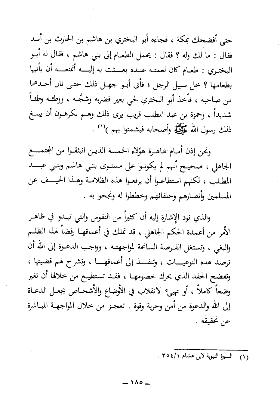 ونحن إذن أمام ظاهرة هؤلاي الخمسة الذين انبثقوا من المجتمع الجاهلي، صحيح أنهم لم يكونوا على مستوى بني هاشم وبني عبد المطلب، لكنهم استطاعوا أن يرفعوا هذه الظلامة وهذا الحيف عن المسلمين وأنصارهم وحلفائهم وخططوا له ونجحوا به.