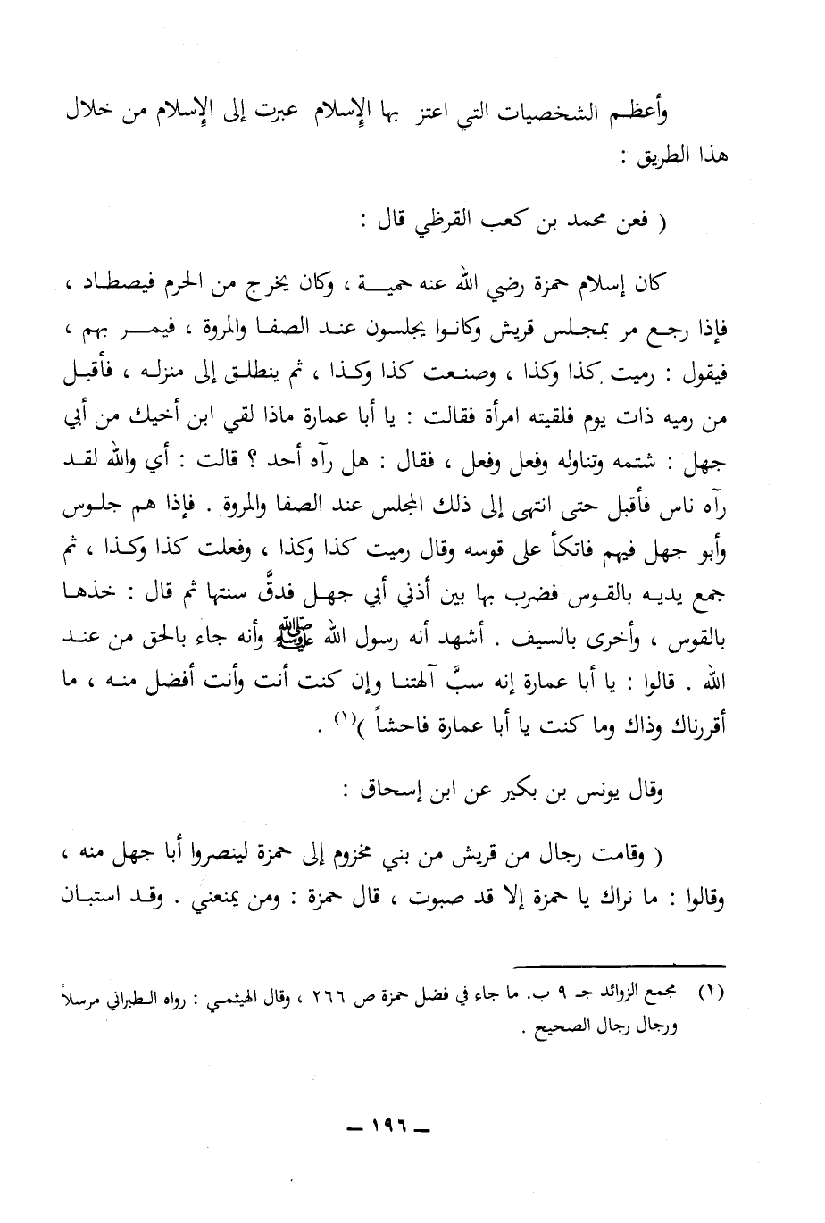 (وقامت رجال من قريش من بني مخزوم إلى حمزة لينصروا أبا جهل منه، وقالوا: ما نراك يا حمزة إلا قد صبوت، قال حمزة: ومن يمنعني. وقد استبان