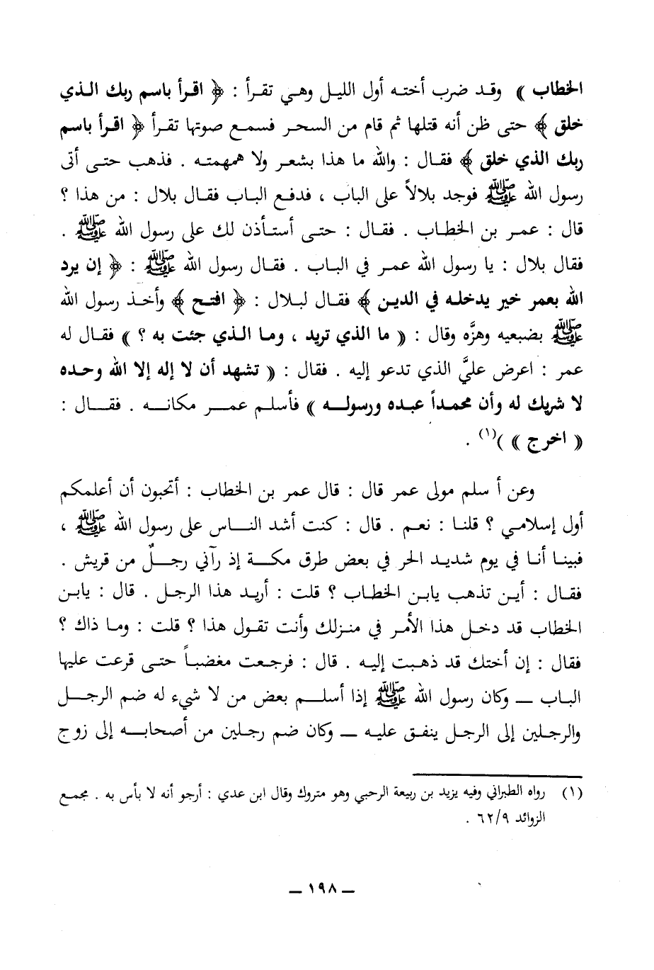 الخطاب)) وقد ضرب أخته أول الليل وهي تقرأ: {اقرأ باسم ربك الذي خلق} حتى ظن أنه قتلها ثم قام من السحر فسمع صوتها تقرأ {اقرأ باسم ربك الذي خلق} فقال: والله ما هذا بشعر ولا همهمته. فذهب حتى أتى رسول الله (ص) فوجد بلالا على الباب، فدفع الباب فقال بلال: من هذا؟ قال: عمر بن الخطاب. فقال: حتى أستأذن لك على رسول الله (ص). فقال بلال: يا رسول الله عمر في الباب. فقال رسول الله (ص): ((إن يرد الله بعمر خير يدخله في الدين)) فقال لبلال: ((افتح)) وأخذ رسول الله (ص) بضبعيه وهزه وقال: ((ما الذي تريد، وما الذي جئت به؟)) فقال له عمر: اعرض علي الذي تدعو إليه. فقال: ((تشهد أن لا إله إلا الله وحده لا شريك له وأن محمدا عبده ورسوله)) فأسلم عمر مكانه. فقال: ((اخرج)) (¬1).