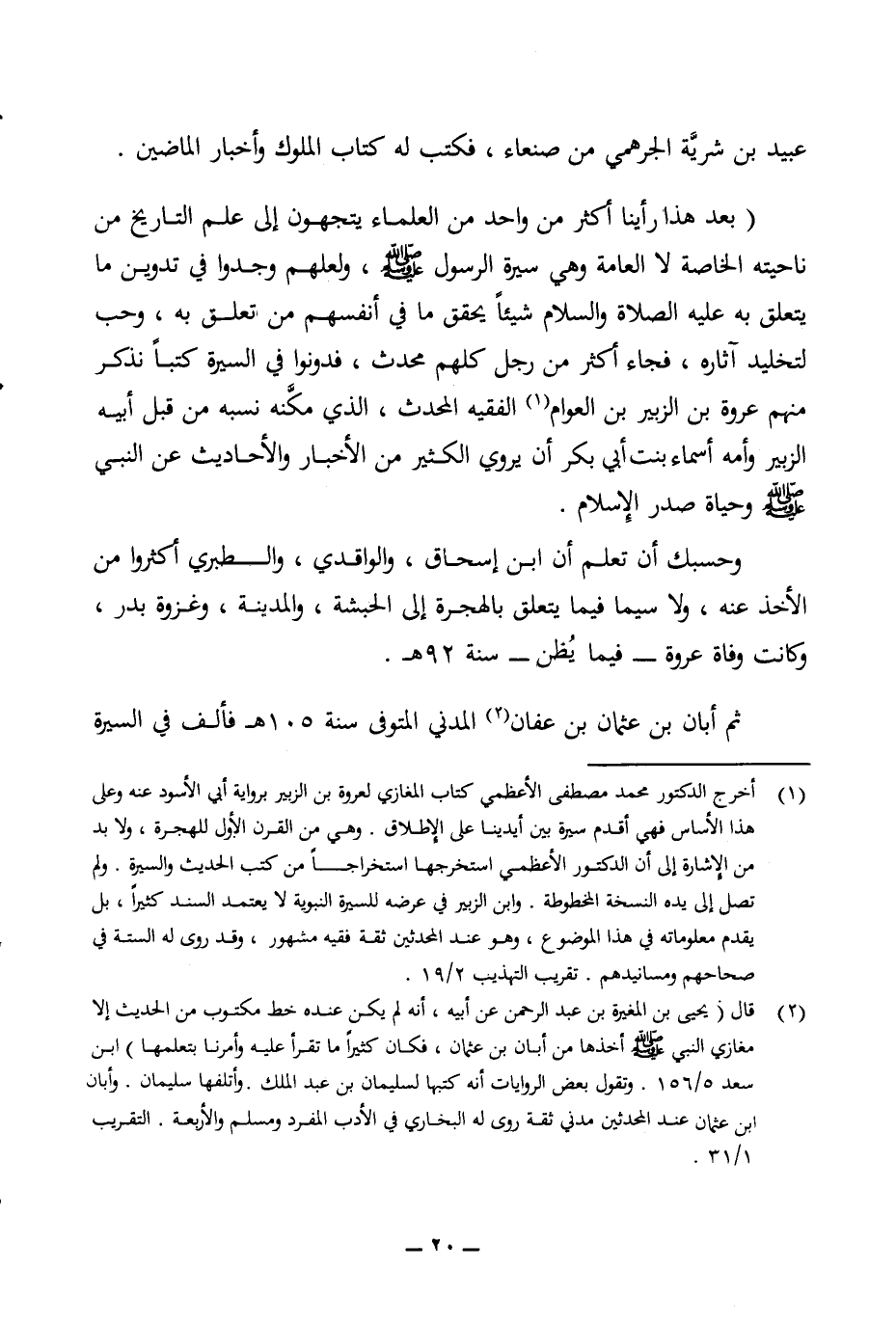 (¬1) أخرج الدكتور محمد مصطفى الأعظمي كتاب المغازي لعروة بن الزبير برواية أبي الأسود عنه وعلى هذا الأساس فهي أقدم سيرة بين أيدينا على الإطلاق. وهي من القرن الأول للهجرة، ولا بد من الإشارة إلى أن الدكتور الأعظمي استخرجها استخراجا من كتب الحديث والسيرة. ولم تصل إلى يده النسخة المخطوطة. وابن الزبير في عرضه للسيرة النبوية لا يعتمد السند كثيرا، بل يقدم معلوماته في هذا الموضوع، وهو عند المحدثين ثقة فقيه مشهور، وقد روى له السته في صحاحهم ومسانيدهم. تقريب التهذيب 2/ 19.