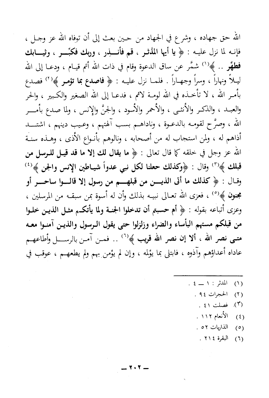 الله حق جهاده، وشرع في الجهاد من حين بعث إلى أن توفاه الله عز وجل، فإنه لما نزل عليه: {يا أيها المدثر قم فأنذر وربك فكبر وثيابك فطهر ..} (¬1) شمر عن ساق الدعوة وقام في ذات الله أتم قيام، ودعا إلى الله ليلا ونهارا، وسرا وجهارا. فلما نزل عليه: {فاصدع بما تؤمر} (¬2) فصدع بأمر الله، لا تأخذه في الله لومة لائم، فدعا إلى الله الصغير والكبير، والحر والعبد، والذكر والأنثى، والأحمر والأسود، والجن والإنس، ولما صدع بأمر الله، وصرح لقومه بالدعوة، وناداهم بسب آلهتهم، وعيب دينهم، اشتد أذاهم له، ولمن استجاب له من أصحابه، ونالوهم بأنوع الأذى، وهذه سنة الله عز وجل في خلقه كما قال تعالى: {ما يقال لك إلا ما قد قيل للرسل من قبلك} (¬3) وقال: {وكذلك جعلنا لكل نبي عدوا شياطين الإنس والجن} (¬4) وقال: {كذلك ما أتى الذين من قبلهم من رسول إلا قالوا ساحر أو مجنون} (¬5)، فعزى الله تعالى نبيه بذلك وأن له أسوة بمن سبقه من المرسلين، وعزى أتباعه بقوله: {أم حسبتم أن تدخلوا الجنة ولما يأتكم مثل الذين خلوا من قبلكم مستهم البأساء والضراء وزلزلوا حتى يقول الرسول والذين آمنوا معه متى نصر الله ألا إن نصر الله قريب} (¬6) .. فمن آمن بالرسل وأطاعهم عاداه أعداؤهم وآذوه، فابتلى بما يؤلمه، وإن لم يؤمن بهم ولم يطعهم، عوقب في
