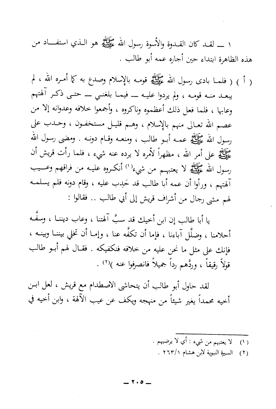 (أ) (فلما بادى رسول الله (ص) قومه بالإسلام وصدع به كما أمره الله، لم يبعد منه قومه، ولم يردوا عليه - فيما بلغني - حتى ذكر آلهتهم وعابها، فلما فعل ذلك أعظموه وناكروه، وأجمعوا خلافه وعدوانه إلا من عصم الله تعالى منهم بالإسلام، وهم قليل مستخفون، وحدب على رسول الله عمه أبو طالب، ومنعه وقام دونه. ومضى رسول الله (ص) على أمر الله، مظهرا لأمره لا يرده عنه شيء، فلما رأت قريش أن رسول الله (ص) لا يعتبهم من شيء (¬1) أنكروه عليه من فراقهم وعيب آلهتهم، ورأوا أن عمه أبا طالب قد حدب عليه، وقام دونه فلم يسلمه لهم مشى رجال من أشراف قريش إلى أبي طالب .. فقالوا:
