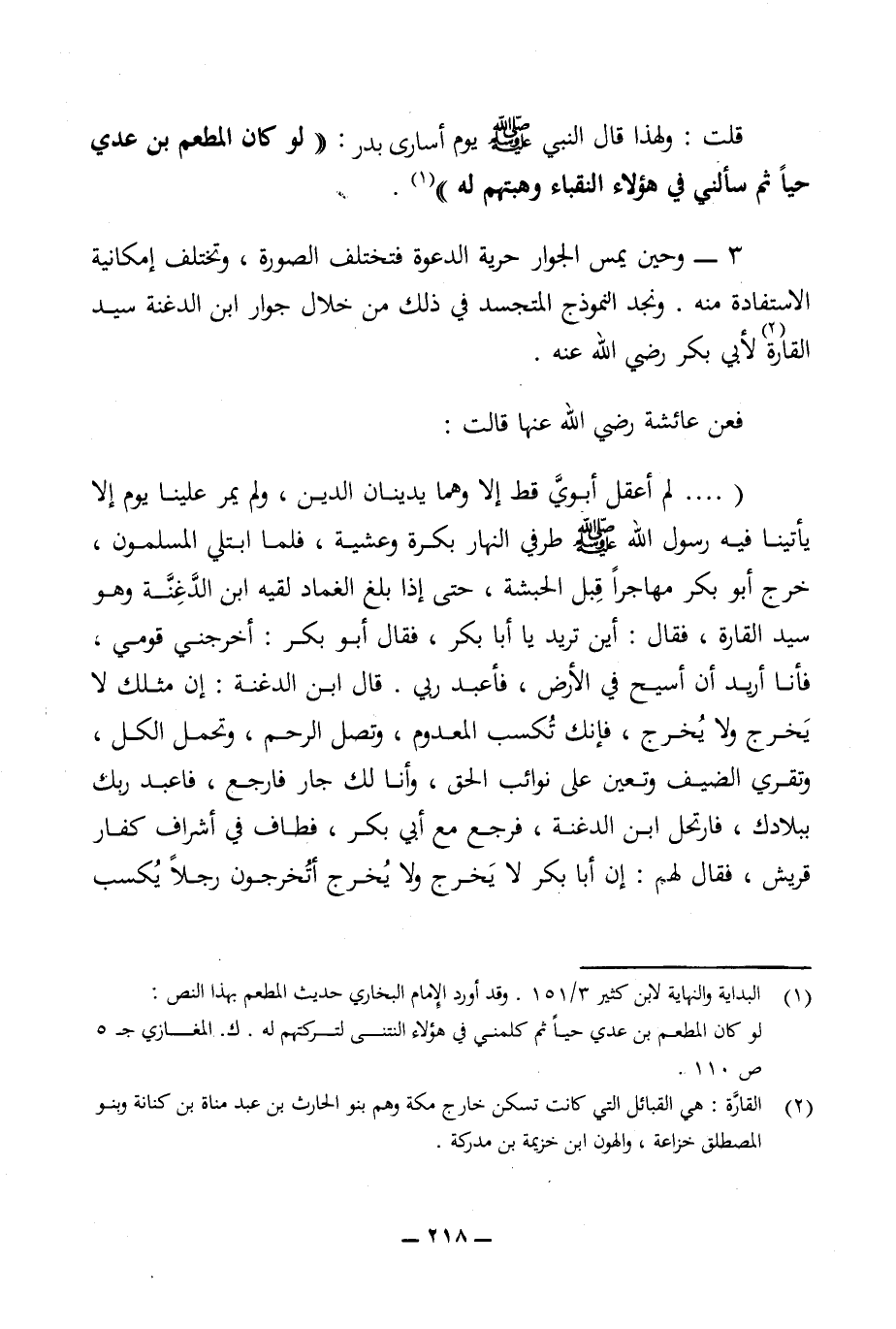 3 - وحين يمس الجوار حرية الدعوة فتختلف الصورة، وتختلف إمكانية الاستفادة منه. ونجد النموذج المتجسد في ذلك من خلال جور ابن الدغنة سيد القارة (¬2) لأبي بكر رضي الله عنه.