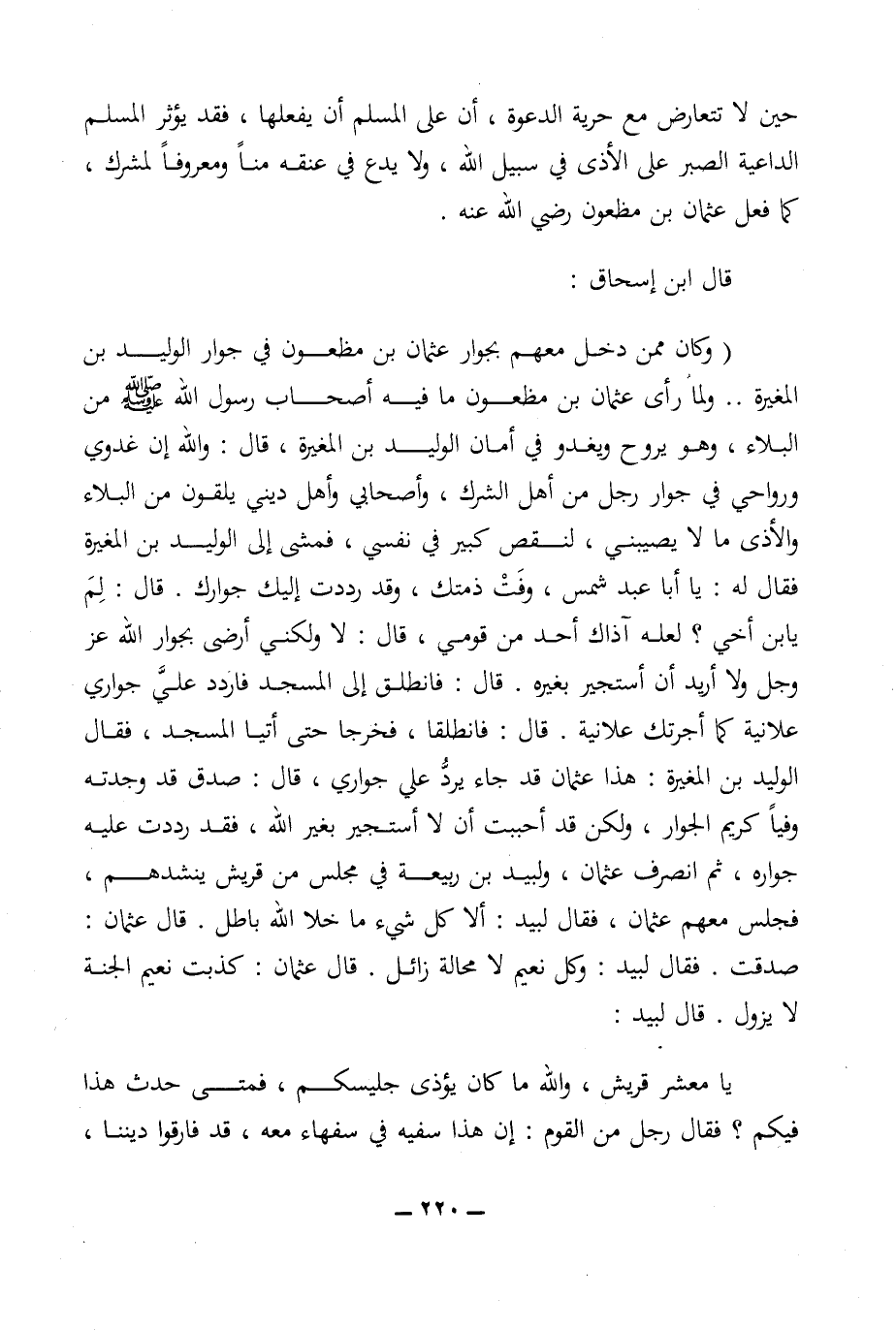 (وكان ممن دخل معهم بجوار عثمان بن مظعون في جوار الوليد بن المغيرة .. ولما رأى عثمان بن مظعون ما فيه أصحاب نول الله (ص) من البلاء، وهو يروح ويغدو في أمان الوليد بن المغيرة، قال: والله إن غدوي ورواحي في جوار رجل من أهل الشرك، وأصحابي وأهل ديني يلقون من البلاء والأذى ما لا يصيبني، لنقص كبير في نفسي، فمشى إلى الوليد بن المغيرة فقال له: يا أبا عبد شمس، وفت ذمتك، وقد رددت إليك جوارك. قال: لم يابن أخي؟ لعله آذاك أحد من قومي، قال: لا ولكني أرضى بجوار الله عز وجل ولا أريد أن أستجير بغيره. قال: فانطلق إلى المسجد فاردد علي جواي علانية كما أجرتك علانية. قال: فانطلقا، فخرجا حتى أتيا المسجد، فقال الوليد بن المغيرة: هذا عثمان قد جاء يرد علي جواري، قال: صدق قد وجدته وفيا كريم الجوار، ولكن قد أحبيت أن لا أستجير بغير الله، فقد رددت عليه جواره، ثم انصرف عثمان، ولبيد بن ربيعة في مجلس من قريش ينشدهم، فجلس معهم عثمان، فقال لبيد: ألا كل شيء ما خلا الله باطل. قال عثمان: صدقت. فقال لبيد: وكل نعيم لا محالة زائل. قال عثمان: كذبت نعيم الجنة لا يزول. قال لبيد: