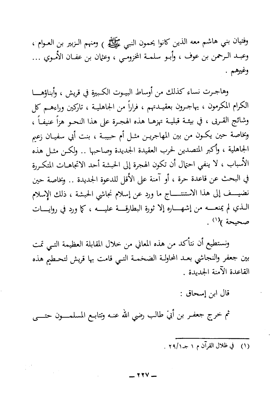 وهاجرت نساء كذلك من أوساط البيوت الكبيرة في قريش، وأبناؤها الكرام المكرمون، يهاجرون بعقيدتهم، فرارا من الجاهلية، تاركين وراءهم كل وشائج القربى، في بيئة قبلية تهزها هذه الهجرة على هذا النحو هزا عنيفا، وبخاصة حين يكون من بين المهاجرين مثل أم حبيبة، بنت أبي سفيان زعيم الجاهلية، وأكبر المتصدين لحرب العقيدة الجديدة وصاحبها .. ولكن مثل هذه الأسباب، لا ينفي احتمال أن تكون الهجرة إلى الحبشة أحد الاتجاهات المتكررة في البحث عن قاعدة حرة، أو آمنة على الأقل للدعوة الجديدة .. وبخاصة حين نضيف إلى هذا الاستنتاج ما ورد عن إسلام نجاشي الحبشة، ذلك الإسلام الذي لم يمنعه من إشهار إلا ثورة البطارقة عليه، كما ورد في روايات صحيحة) (¬1).