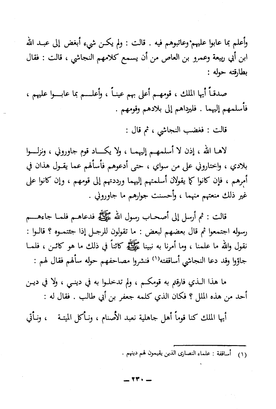 قالت: ثم أرسل إلى أصحاب رسول الله (ص) فدعاهم فلما جاءهم رسوله اجتمعو ثم قال بعضهم لبعض: ما تقولون للرجل إذا جئتموه؟ قالوا: نقول والله ما علمنا، وما أمرنا به نبينا (ص) كائنا في ذلك ما هو كائن، فلما جاؤوا وقد دعا النجاشي أساقفته (¬1) فنشروا مصاحفهم حوله سألهم فقال لهم: ما هذا الذي فارقتم به قومكم، ولم تدخلو به في ديني، ولا في دين أحد من هذه الملل؟ فكان الذي كلمه جعفر بن أبي طالب. فقال له: أيها الملك كنا قوما أهل جاهلية نعبد الأصنام، ونأكل الميتة، ونأتي