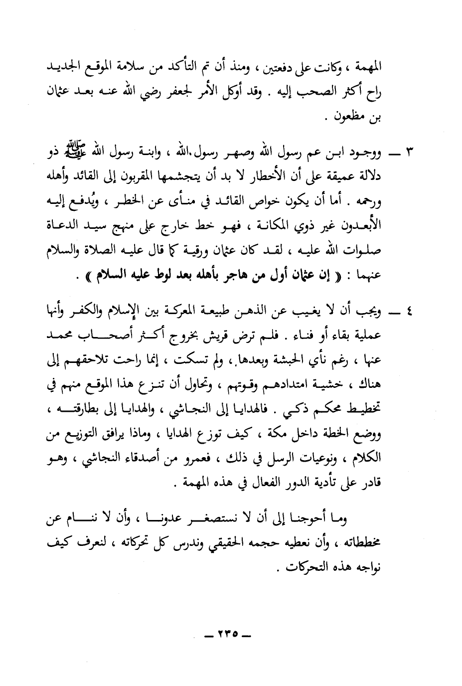 4 - ويجب أن لا يغيب عن الذهن طبيعة المعركة بين الإسلام والكفر وأنها عملية بقاء أو فناء. فلم ترض قريش بخروج أكثر أصحاب محمد عنها، رغم نأي الحبشة وبعدها، ولم تسكت، إنما راحت تلاحقهم إلى هناك، خشية امتدادهم وقوتهم، وتحاول أن تنزع هذا الموقع منهم في تخطيط محكم ذكي. فالهدايا إلى النجاشي، والهدايا إلى بطارقته، ووضع الخطة داخل مكة، كيف توزع الهدايا، وماذا يرافق التوزيع من الكلام، ونوعيات الرسل في ذلك، فعمرو من أصدقاء النجاشي، وهو قادر على تأدية الدور الفعال في هذه المهمة.
