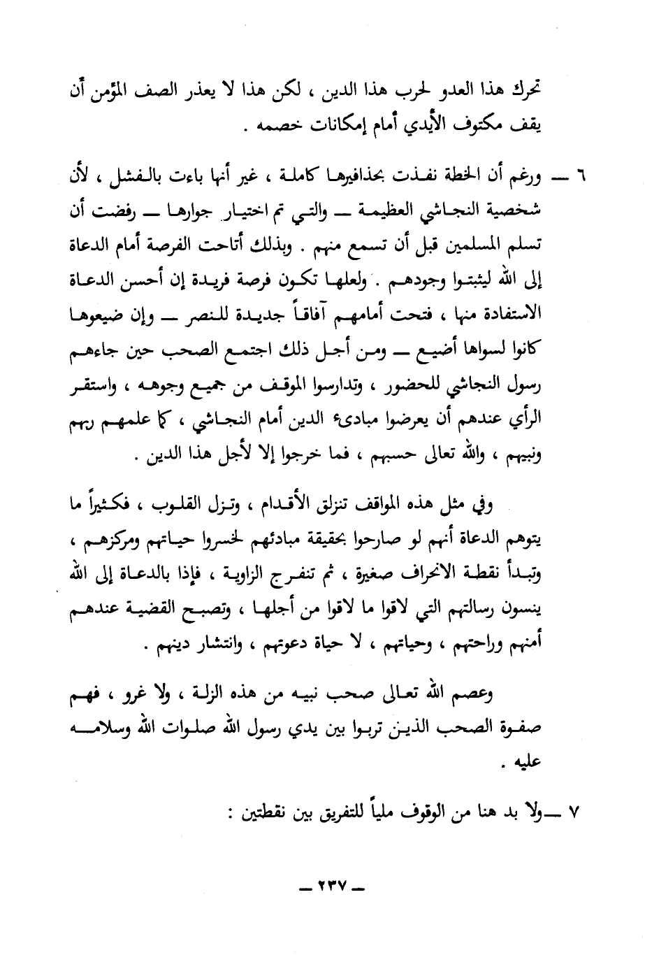 6 - ورغم أن الخطة نفذت بحذافيرها كاملة، غير أنها باءت بالفشل، لأن شخصية النجاشي العظيمة - والتي تم اختيار جوارها - رفضت أن تسلم المسلمين قبل أن تسمع منهم. وبذلك أتاحت الفرصة أمام الدعاة إلى الله ليثبتوا وجودهم. ولعلها تكون فرصة فريدة إن أحسن الدعاة الاستفادة منها، فتحت أمامهم آفاقا جديدة للنصر - وإن ضيعوها كانوا لسوها أضيع - ومن أجل ذلك اجتمع الصحب حين جاءهم رسول النجاشي للحضور، وتدارسوا الموقف من جميع وجوهه، ةاستقر الرأي عندهم أن يعرضوا مبادىء الدين أمام النجاشي، كما علمهم ربهم ونبيهم، والله تعالى حسبهم، فما خرجوا إلا لأجل هذا الدين.