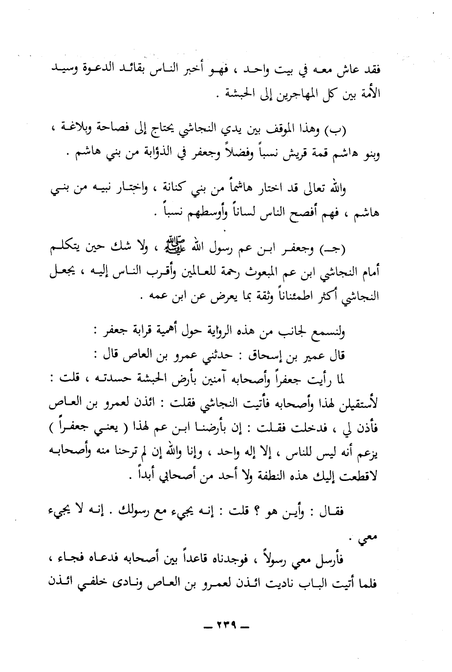 (ب) وهذا الموقف بين يدي النجاشي يحتاج إلى فصاحة وبلاغة، وبنو هاشم قمة قريش نسبا وفضلا وجعفر في الذؤابة من بني هاشم. والله تعالى قد اختار هاشما من بني كنانة، واختار نبيه من بني هاشم، فهم أفصح الناس لسانا وأوسطهم نسبا.