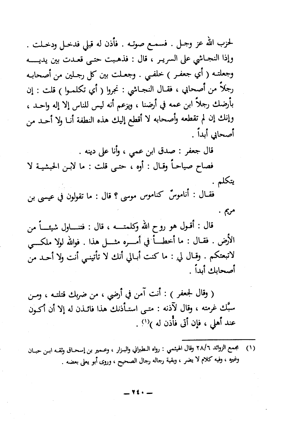 وإذا النجاشي على السرير، قال: فذهبت حتى قعدت بين يديه وجعلته (أي جعفر) خلفي. وجعلت بين كل رجلين من أصحابه رجلا من أصحابي، فقال النجاشي: نجروا (أي تكلموا) قلت: إن بأرضك رجلا ابن عمه في أرضنا، ويزعم أنه ليس للناس إلا إله واحد، وإنك إن لم تقطعه وأصحابه لا أقطع إليك هذه النطفة أنا ولا أحد من أصحابي أبدا.