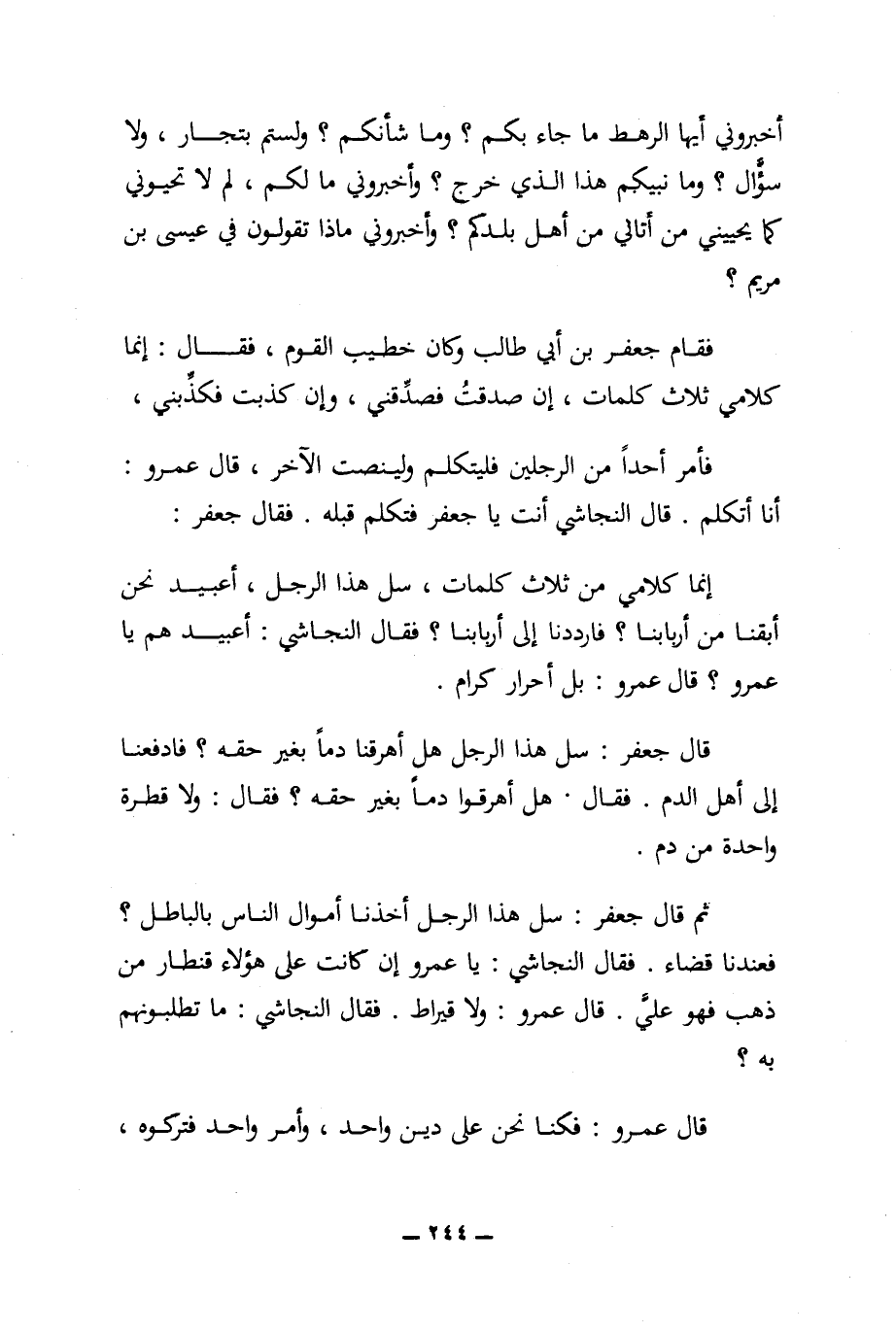 أنا أتكلم. قال النجاشي أنت يا جعفر فتكلم قبله. فقال جعفر: إنما كلامي من ثلاث كلمات، سل هذا الرجل، أعبيد نحن أبقنا من أربابنا؟ فارددنا إلى أربابنا؟ فقال النجاشي: أعبيد هم يا عمرو؟ قال عمرو: بل أحرار كرام.