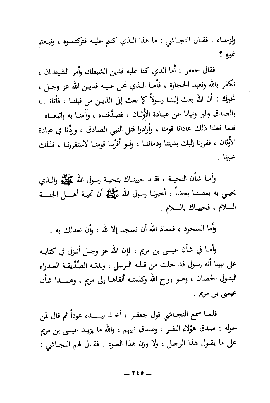 فقال جعفر: أما الذي كنا عليه فدين الشيطان وأمر الشيطان، نكفر بالله ونعبد الحجارة، فأما الذي نحن عليه فدين الله عز وجل، نخبرك: أن الله بعث إلينا رسولا كما بعث إلى الذين من قبلنا، فأتانا بالصدق والبر ونهانا عن عبادة الأوثان، فصدقناه، وآمنا به واتبعناه. فلما فعلنا ذلك عادانا قومنا، وأرادوا قتل النبي الصادق، وردنا في عبادة الأوثان، ففررنا إليك بديننا ودمائنا، ولو أقرنا قومنا لاستقررنا، فذلك خبرنا.
