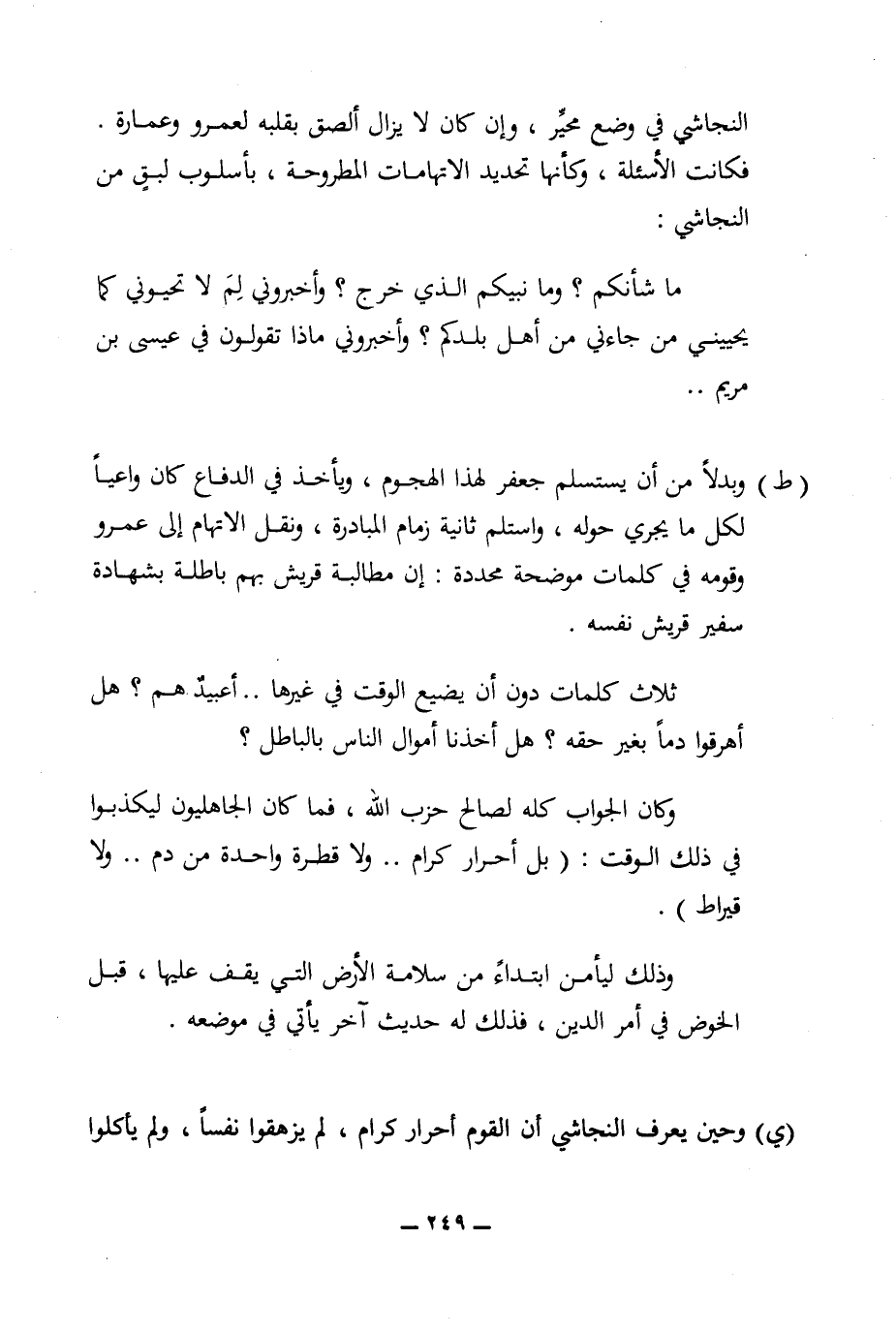 (ط) وبدلا من أن يستسلم جعفر لهذا الهجوم، ويأخذ في الدفاع كان واعيا لكل ما يجري حوله، واستلم ثانية زمام المبادر، ونقل الاتهام إلى عمرو وقومه في كلمات موضحة محددة: إن مطالبة قريش بهم باطلة بشهادة سفير قريش نفسه.