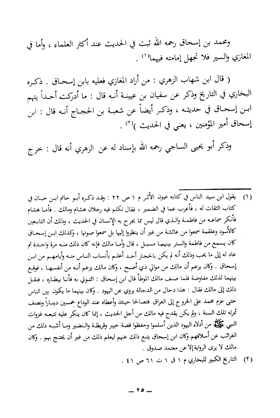 (قال ابن شهاب الزهري: من أراد المغازي فعليه بابن إسحاق. ذكره البخاري في التاريخ وذكر عن سفيان بن عيينة أنه قال: ما أدركت أحدا يتهم ابن إسحاق في حديثه، وذكر أيضا عن شعبة بن الحجاج أنه قال: ابن إسحاق أمير المؤمنين، يعني في الحديث) (¬2).