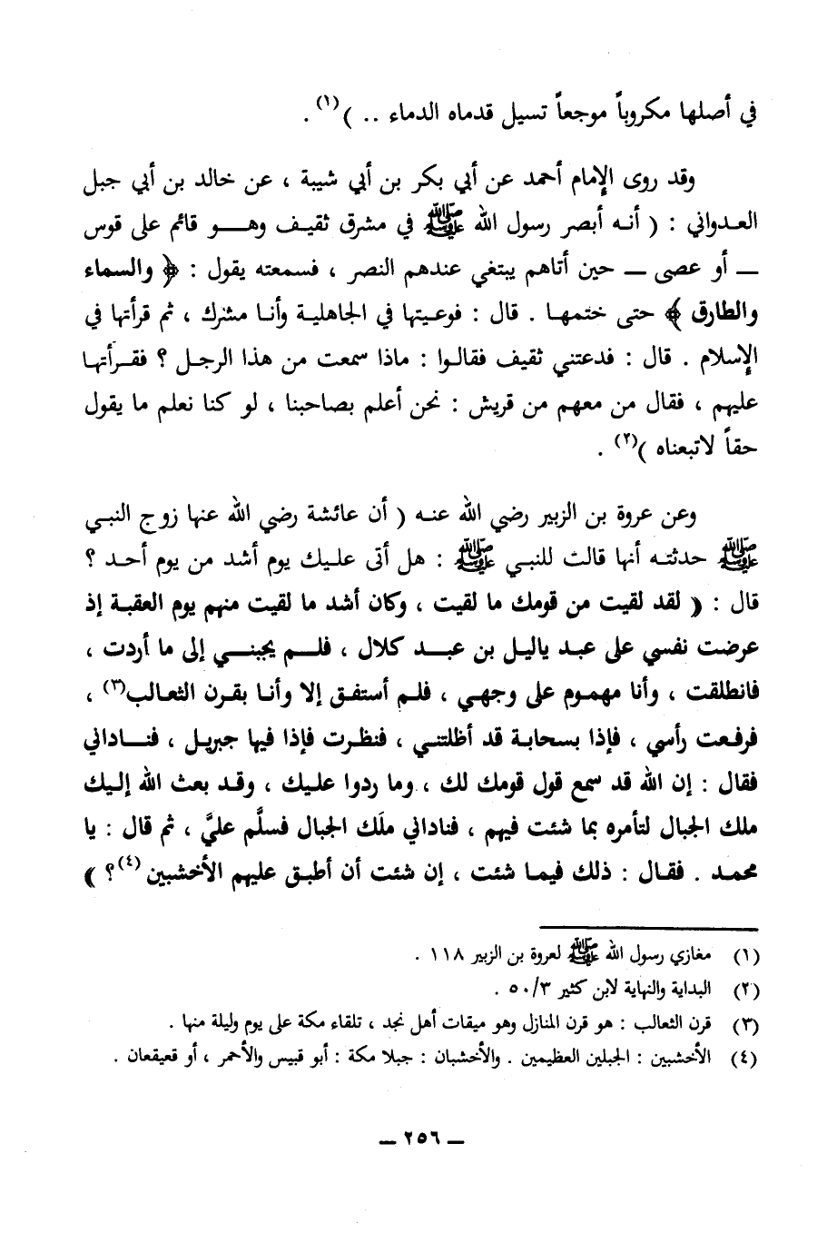 وعن عروة بن الزبير رضي الله عنه (أن عائشة رضي الله عنها زوج النبي (ص) حدثته أنها قالث للنبي (ص): هل أتى عليك يوم أشد من يوم أحد؟ قال: ((لقد لقيت من قومك ما لقيت، وكان أشد ما لقيت منهم يوم العقة إذ عرضت نفسي على عبد ياليل بن عبد كلال، فلم يجبني إلى ما أردت، فانطلقت، وأنا مهموم على وجهي، فلم أستفق إلا وأنا بقرن الثعالب (¬3)، فرفعت رأسي، فإذا بسحابة قد أظلتني، فنظرت فإذا فيها جبريل، فناداني فقال: إن الله قد سمع قول قومك لك، وما ردوا عليك، وقد بعث الله إليك ملك الجبال لتأمره بما شئت فيهم، فناداني ملك الجبال فسلم علي، ثم قال: يا محمد. فقال: ذلك فيما شئت، إن شئت أن أطبق عليهم الأخشبين (¬4)؟)