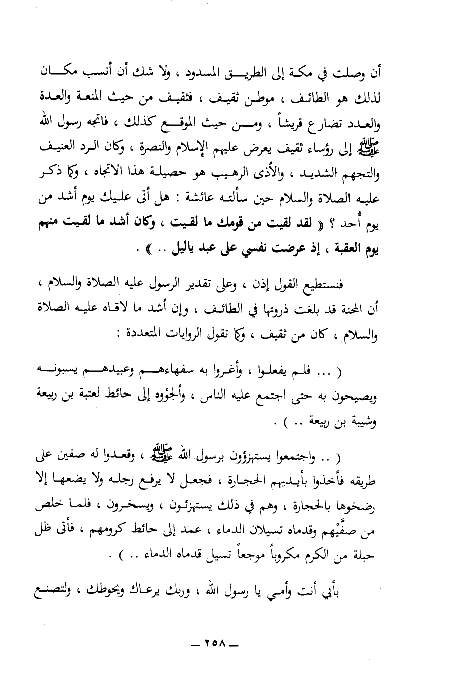 (.. واجتمعوا يستهزؤون برسول الله (ص)، وقعدوا له صفين على طريقه فأخذوا بأيديهم الحجارة، فجعل لا يرفع رجله ولا يضعها إلا رضخوها بالحجارة، وهم في ذلك يستهزئون، ويسخرون، فلما خلص من صفيهم وقدماه تسيلان الدماء، عمد إلى حائط كرومهم، فأتى ظل حبلة من الكرم مكروبا موجعا تسيل قدماه الدماء ..).