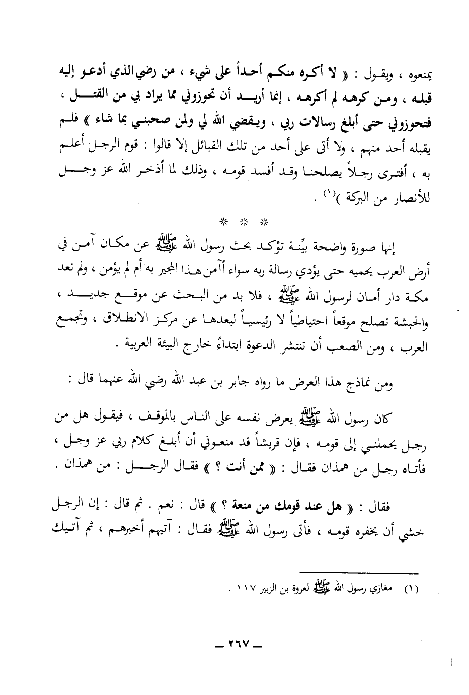 يمنعوه، ويقول: ((لا أكره منكم أحدا على شيء، من رضي الذي أدعو إليه قلبه، ومن كرهه لم أكرهه، إنما أريد أن تحوزوني مما يراد بي من القتل، فتحوزوني حتى أبلغ رسالات ربي، ويقضي الله لي ولمن صحبني بما شاء)) فلم يقبله أحد منهم، ولا أتى على أحد من تلك القبائل إلا قالوا: قوم الرجل أعلم به، أفترى رجلا يصلحنا وقد أفسد قومه، وذلك لما أذخر الله عز وجل للأنصار من البركة) (¬1).
