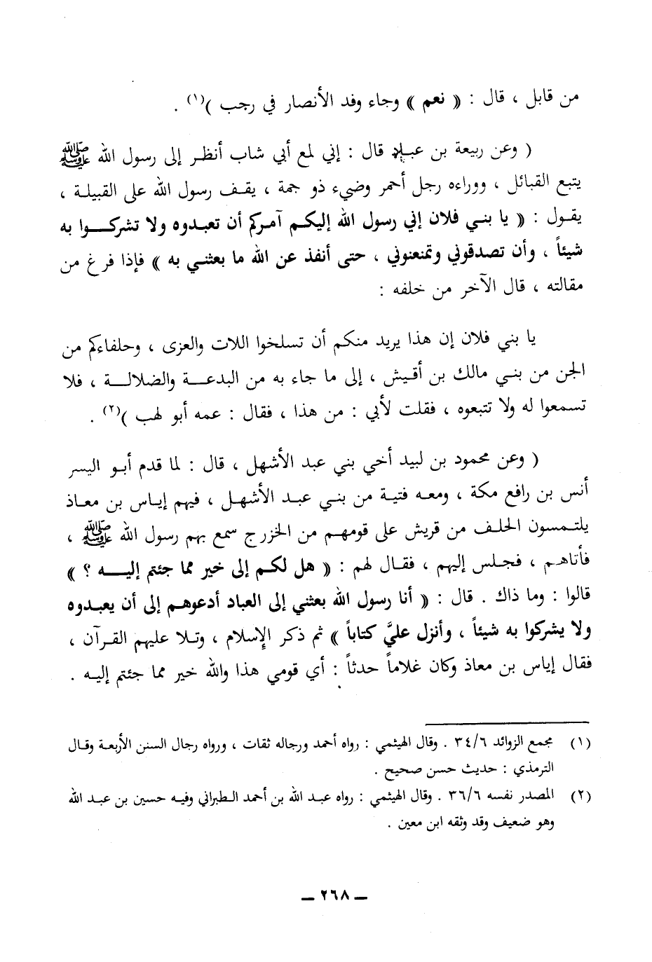 (وعن محمود بن لبيد أخي بني عبد الأشهل، قال: لما قدم أبو اليسر أنس بن رافع مكة، ومعه فتية من بني عبد الأشهل، فيهم إياس بن معاذ يلتمسون الحلف من قريش على قومهم من الخزرج سمع بهم رسول الله (ص)، فأتاهم، فجلس إليهم، فقال لهم: ((هل لكم إلى خير مما جم إيه؟)) قالوا: وما ذاك. قال: ((أنا رسول الله بعثني إلى العباد أدعوهم إلى أن يعبدوه ولا يشركوا به شيئا، وأنزل علي كتابا)) ثم ذكر الإسلام، وتلا عليهم القرآن، فقال إياس بن معاذ وكان غلاما حدثا: أي قومي هذا والله خير مما جئتم إليه.