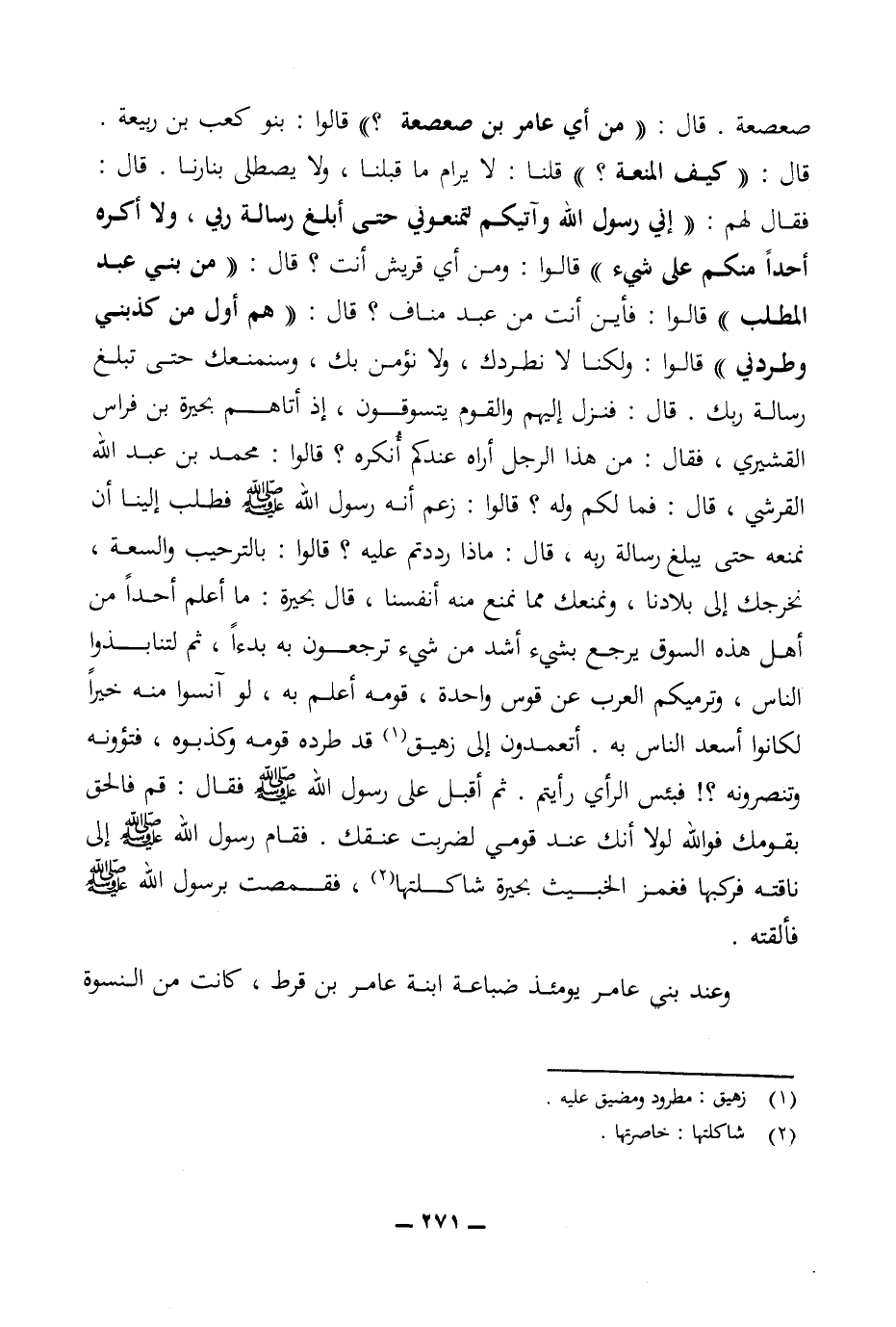 صعصعة. قال: ((من أي عامر بن صعصعة؟)) قالوا: بنو كعب بن ربيعة. قال ((كيف المنعة؟)) قلنا: لا يرام ما قبلنا، ولا يصطلى بناربا. قال: فقال لهم: ((إني رسول الله وآتيكم لتمنعوني حتى أبلغ رسالة ربي، ولا أكره أحدا منكم على شيء)) قالوا: ومن أي قريش أنت؟ قال: ((من بني عبد المطلب)) قالوا: فأين أنت من عبد مناف؟ قال: ((هم أول من كذبني وطردني)) قالوا: ولكنا لا نطردك، ولا نؤمن بك، وسنمنعك حتى تبلغ رسالة ربك. قال: فنزل إليهم والقوم يتسوقون، إذ أتاهم بحيرة بن فراس القشيوي، فقال: من هذا الرجل أراه عندكم أنكره؟ قالوا: محمد بن عبد الله القرشي، قال: فما لكم وله؟ قالوا: زعم أنه رسول الله (ص) فطلب إلينا أن نمنعه حتى يبلغ رسالة ربه، قال: ماذا رددتم عليه؟ قالوا: بالترحيب والسعة، نخرجك إلى بلادنا، ونمنعك مما نمنع منه أنفسنا، قال بحيرة: ما أعلم أحدا من أهل هذه السوق يرجع بشيء أشد من شيء ترجعون به بدءا، ثم لتنابذوا الناس، وترميكم العرب عن قوس واحدة، قومه أعلم به، لو آنسوا منه خيرا لكانوا أسعد الناس به. أتعمدون إلى زعيق (¬1) قد طرده قومه وكذبوه، فتؤونه وتنصرونه؟! فبئس الرأي رأيتم. ثم أقبل على رسول الله (ص) فقال: قم فالحق بقومك فوالله لولا أنك عند قومي لضربت عنقك. فقام نول الله (ص) إلى ناقته فركبها فغمز الخبيث بحيرة شاكلتها (¬2)، فقمصت برسول الله (ص) فألقته.