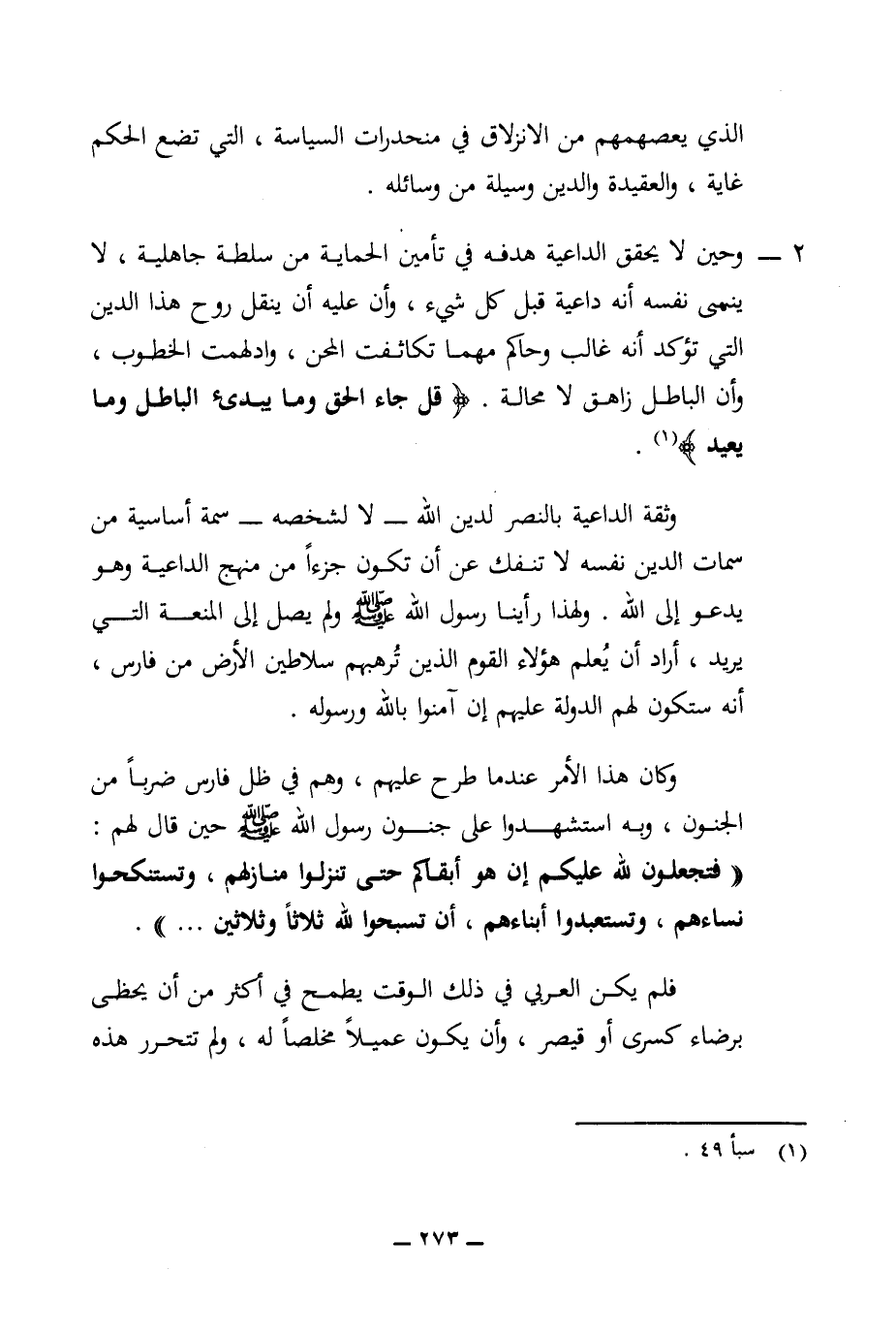 2 - وحين لا يحقق الداعية هدفه في تأمين الحماية من سلطة جاهلية، لا ينسى نفسه أنه داعية قبل كل شيء، وأن عليه أن ينقل روح هذا الدين التي تؤكد أنه غالب وحاكم مهما تكاثفت المحن، وادلهمت الخطوب، وأن الباطل زاهق لا محالة. {قل جاء الحق وما يبدئ الباطل وما يعيد} (¬1).