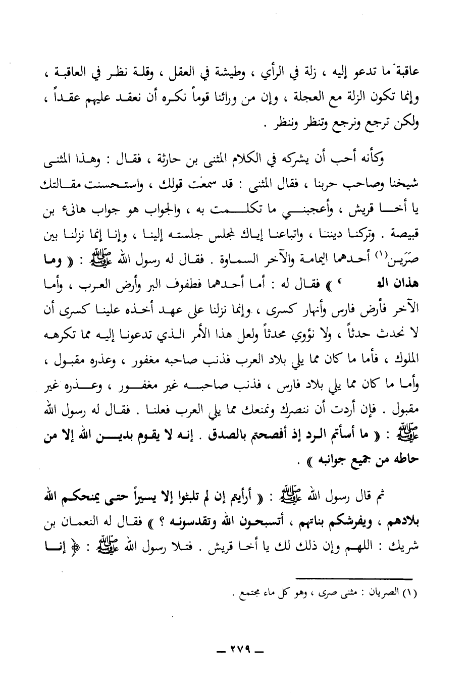 وكأنه أحب أن يشركه في الكلام المثنى بن حارثة، فقال: وهذا المثنى شيخنا وصاحب حربنا، فقال المثنى: قد سمعت قولك، واستحسنت مقالتك يا أخا قريش، وأعجبني ما تكلمت به، والجواب هو جواب هانىء بن قبيصة. وتركنا ديننا، واتباعنا إياك لمجلس جلسته إلينا، وإنا إنما نزلنا بين صرين (¬1) أحدهما اليمامة والآخر السماوة. فقال له رسول الله (ص): ((وما هذان الصريان؟)) فقال له: أما أحدهما فطفوف البر وأرض العرب، وأما الآخر فأرض فارس وأنهار كسرى، وإنما نزلنا على عهد أخذه علينا كسرى أن لا نحدث حدثا، ولا نؤوي محدثا ولعل هذا الأمر الذي تدعونا إليه مما تكرهه الملوك، فأما ما كان مما يلي بلاد العرب فذنب صاحبه مغفور، وعذره مقبول، وأما ما كان مما يلي بلاد فارس، فذنب صاحبه غير مغفور، وعذره غير مقبول. فإن أردت أن ننصرك ونمنعك مما يلي العرب فعلنا. فقال له رسول الله (ص): ((ما أسأتم الرد إذ أفصحتم بالصدق. إنه لا يقوم بدين الله إلا من حاطه من جميع جوانبه)).
