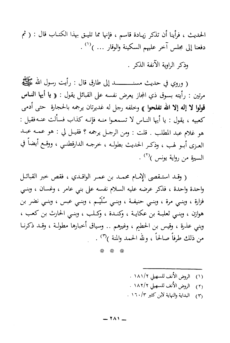 (وقد استقصى الإمام محمد بن عمر الواقدي، فقص خبر القبائل واحدة واحدة، فذكر عرضه عليه السلام نفسه على بني عامر، وغسان، وبني فزارة، وبني مرة، وبني حنيفة، وبني سليم، وبني عبس، وبني نضر بن هوازن، وبني ثعلبة بن عكاية، وكندة، وكلب، وبني الحارث بن كعب، وبني عذرة، وقيس بن الحطيم، وغيرهم .. وسياق أخبارها مطولة، وقد ذكرنا من ذلك طرفا صالحا، ولله الحمد والمنة) (¬3).
