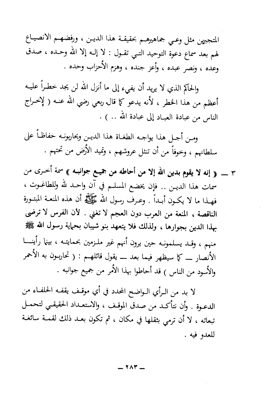 3 - ((إنه لا يقوم بدين الله إلا من أحاطه من جميع جوانبه) سمة أخرى من سمات هذا الدين .. فإن يخضع المسلم في آن لأحد لله وللطاغوت، فهذا ما لا يكون أبدا. وعرف رسول الله (ص) أن هذه المنعة المبتورة الناقصة، المنعة من العرب دون العجم لا تعني. لأن الفرس لا ترضى بهذا الدين بجوارها، ولذلك فلا يتعهد بنو شيبان بحماية رسول الله (ص) منهم، وقد يسلمونه حين يرون أنهم غير ملزمين بحمايته، بينما رأينا الأنصار - كما سيظهر فيما بعد - يقول قائلهم: (تحاربون به الأحمر والأسود من الناس) قد أحاطوا بهذا الأمر من جميع جوانبه.