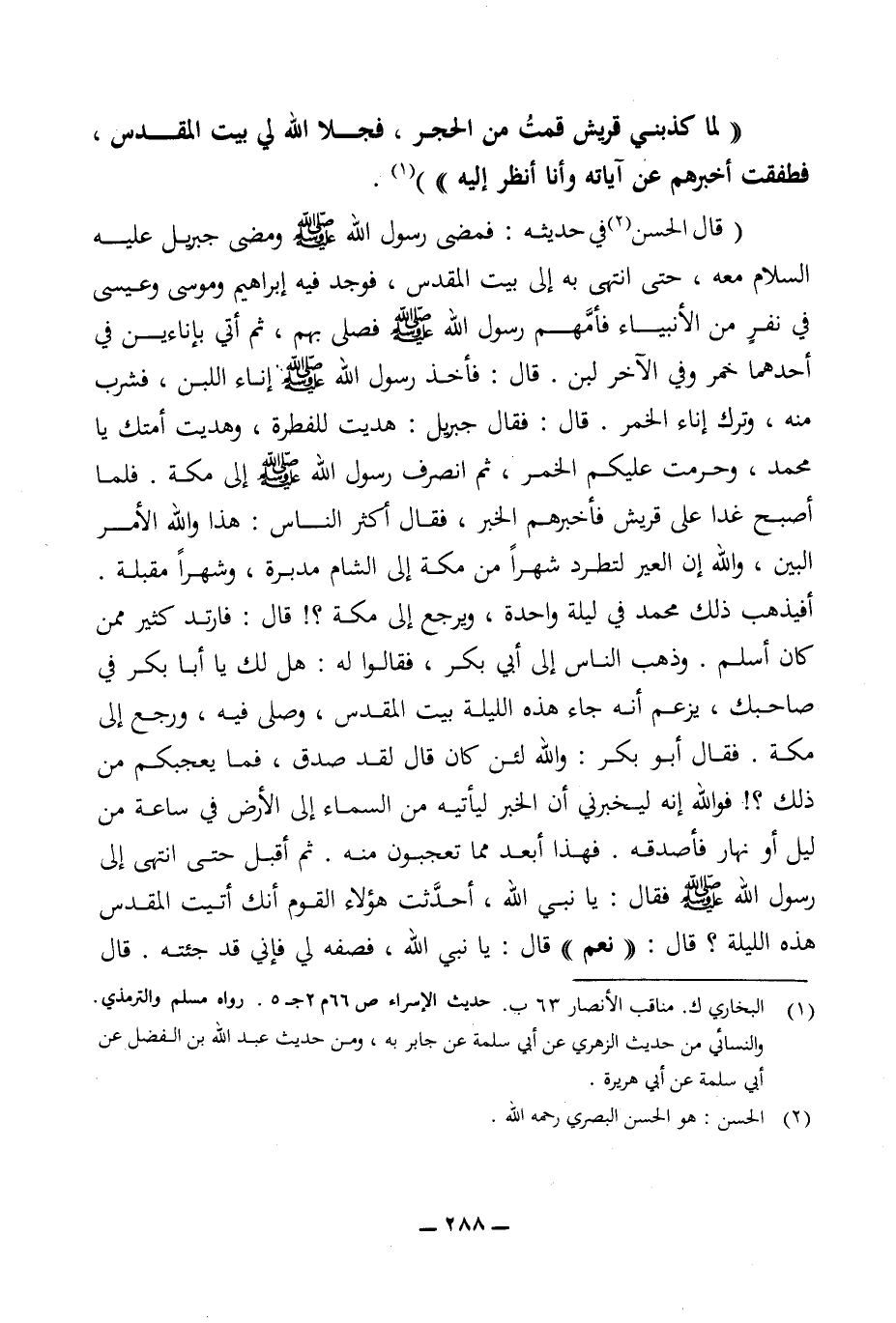 (قال الحسن (¬2) في حديثه: فمضى رسول الله (ص) ومضى جبريل عليه السلام معه، حتى انتهى به إلى بيت المقدس، فوجد فيه إبراهيم وموسى وعيسى في نفر من الأنبياء فأمهم رسول الله (ص) فصلى بهم، ثم أتي بإناءين في أحدهما خمر وفي الآخر لبن. قال: فأخذ رسول الله (ص) إناء اللبن، فشرب منه، وترك إناء الخمر. قال: فقال جبريل: هديت للفطرة، وهديت أمتك يا محمد، وحرمت عليكم الخمر، ثم انصرف رسول الله (ص) إلى مكة. فلما أصبح غدا على قريش فأخبرهم الخبر، فقال أكثر الناس: هذا والله الأمر البين، والله إن العير لتطرد شهرا من مكة إلى الشام مدبرة، وشهرا مقبلة. أفيذهب ذلك محمد في ليلة واحدة، ويرجع إلى مكة؟! قال: فارتد كثير ممن كان أسلم. وذهب الناس إلى أبي بكر، فقالوا له: هل لك يا أبا بكر في صاحبك، يزعم أنه جاء هذه الليلة بيت المقدس، وصلى فيه، ورجع إلى مكة. فقال أبو بكر: والله لئن كان قال لقد صدق، فما يعجبكم من ذلك؟!. فوالله إنه ليخبرني أن الخبر ليأتيه من السماء إلى الأرض في ساعة من ليل أو نهار فأصدقه. فهذا أبعد مما تعجبون منه. ثم أقبل حتى انتهى إلى رسول الله (ص) فقال: يا نبي الله، أحذثت هؤلاء القوم أنك أتيت المقدس هذه الليلة؟ قال: ((نعم)) قال: يا نبي الله، فصفه لي فإني قد جئته. قال