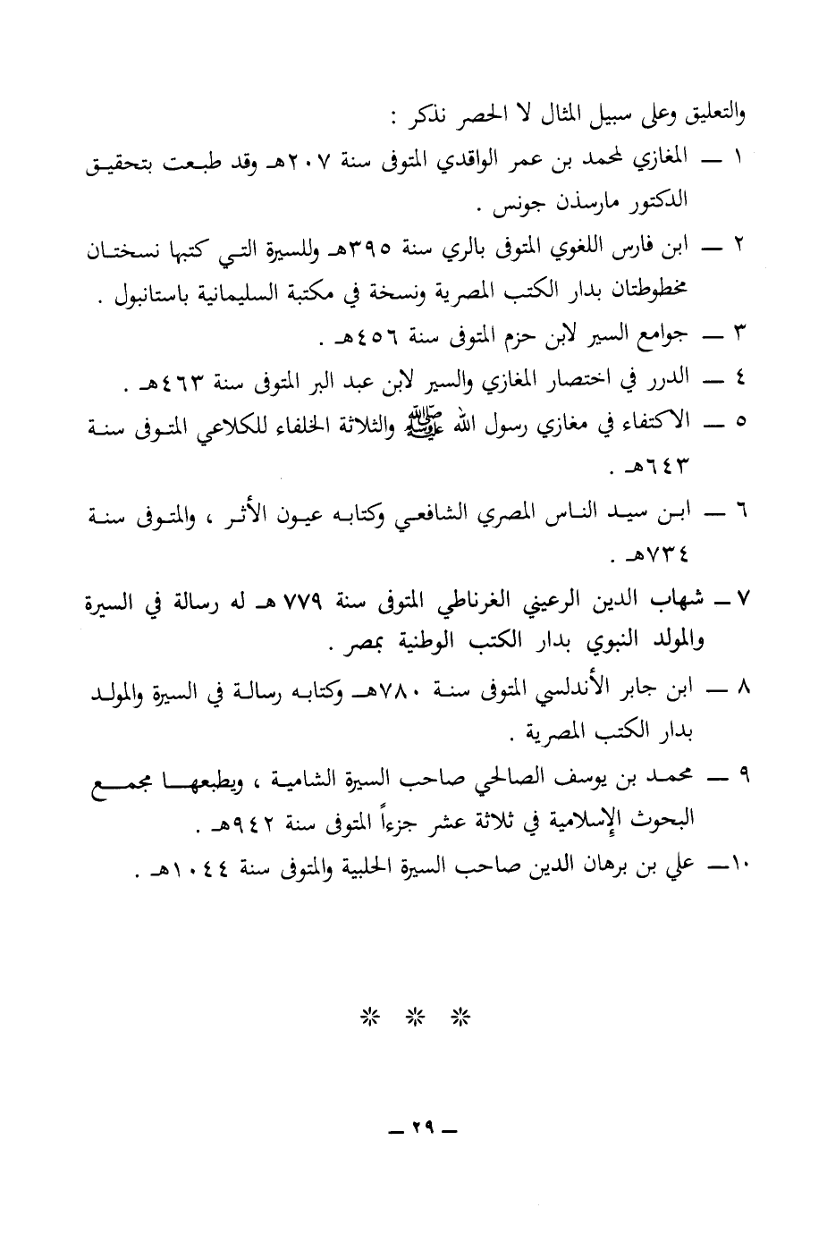 2 - ابن فارس اللغوي المتوفى بالري سنة 395 هـ وللسيرة التي كتبها نسختان مخطوطتان بدار الكتب المصرية ونسخة في مكتبة السليمانية باستانبول.
