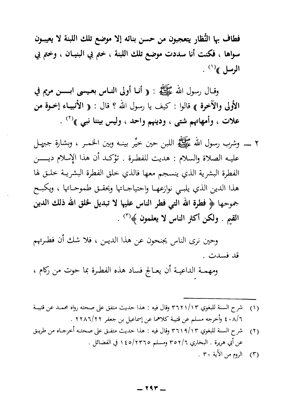 (¬2) شرح السنة للبغوي 13/ 3619 وقال فيه: هذا حديث متفق على صحته أخرجاه من طريق عن أبي هريرة. البخاري 352/ 6 ومسلم 2365/ 145 في الفضائل.