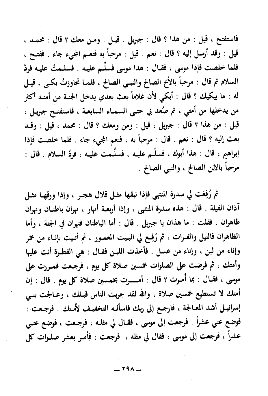 ثم رفعت لي سدرة المنتهى فإذا نبقها مثل قلال هجر، وإذا ورقها مثل آذان الفيلة. قال هذه سدرة المنتهي، وإذا أربعة أنهار، نهران باطنان ونهران ظاهران. فقلت: ما هذان يا جبريل. قال: أما الباطنان فنهران في الجنة، وأما الظاهران فالنيل والفرات، ثم رفع لي البيت المعمور، ثم أتيت بإناء من خمر وإناء من لبن، وإناء من عسل. فأخذت اللبن فقال: هي الفطرة أنت عليها وأمتك، ثم فرضت علي الصلوات خمسين صلاة كل يوم، فرجعت فمررت على موسى، فقال: بما أمرت؟ قال: أمرت بخمسين صلاة كل يوم. قال: إن أمتك لا تستطيع خمسين صلاة، والله لقد جربت الناس قبلك، وعالجت بني إسرائيل أشد المعالجة، فارجع إلى ربك فاسأله التخفيف لأمتك. فرجعت: فوضع عني عشرا. فرجعت إلى موسى، فقال لي مثله، فرجعت، فوضع عني عشرا، فرجت إلى موسى، فقال لي مثله، فرجعت: فأمر بعشر صلوات كل