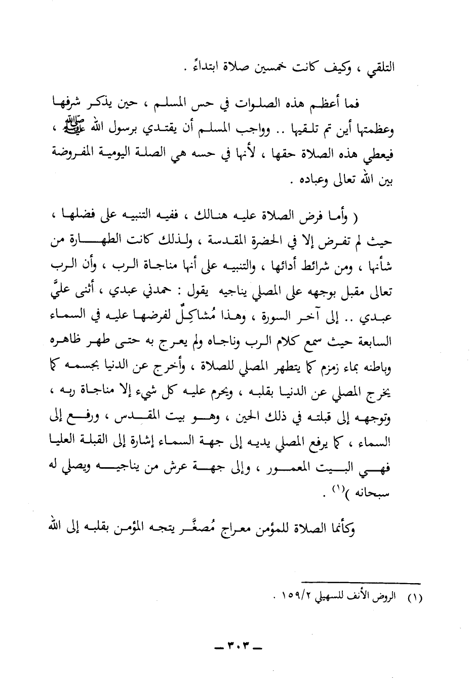 (وأما فرض الصلاة عليه هنالك، ففيه التنبيه على فضلها، حيث لم تفرض إلا في الحضرة المقدسة، ولذلك كانت الطهارة من شأنها، ومن شرائط أدائها، والتنبيه على أنها مناجاة الرب، وأن الرب تعالى مقبل بوجهه على المصلي يناجيه يقول: حمدني عبدي، أثنى علي عبدي .. إلى آخر السورة، وهذا مشاكل لفرضها عليه في السماء السابعة حيث سمع كلام الرب وناجاه ولم يعرج به حتى طهر ظاهره وباطنه بماء زمزم كما يتطهر المصلي للصلاة، وأخرج عن الدنيا بجسمه كما يخرج المصلي عن الدنيا بقلبه، ويحرم عليه كل شيء إلا مناجاة ربه، وتوجهه إلى قبلته في ذلك الحين، وهو بيت المقدس، ورفع إلى السماء، كما يرفع المصلي يديه إلى جهة السماء إشارة إلى القبلة العليا فهي البيت المعمور، وإلى جهة عرش من يناجيه ويصلي له سبحانه) (¬1).