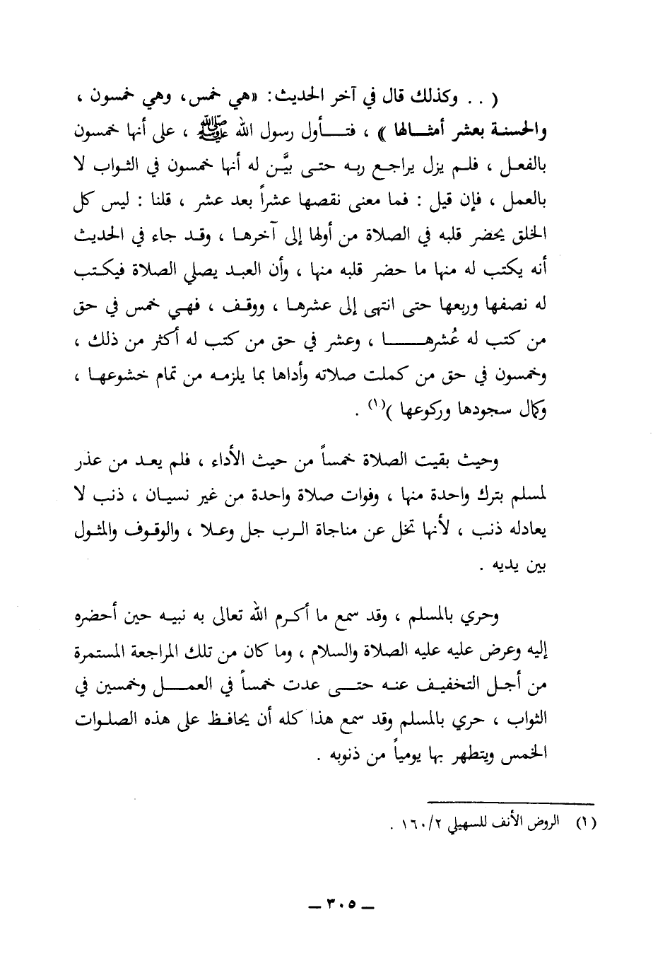 (.. وكذلك قال في آخر الحديث: ((هي خمس، وهي خمسون، والحسنة بعشر أمثالها))، فتأول رسول الله (ص)، على أنها خمسون بالفعل، فلم يزل يراجع ربه حتى بين له أنها خمسون في الثواب لا بالعمل، فإن قيل: فما معنى نقصها عشرا بعد عشر، قلنا: ليس كل الخلق يحضر قلبه في الصلاة من أولها إلى آخرها، وقد جاء في الحديث أنه يكتب له منها ما حضر قلبه منها، وأن العبد يصلي الصلاة فيكتب له نصفها وربعها حتى انتهى إلى عشرها، ووقف، فهي خمس في حق من كتب له غشرها، وعشر في حق من كتب له أكثر من ذلك، وخمسون في حق من كملت صلاته وأداها بما يلزمه من تمام خشوعها، وكمال سجودها وركوعها) (¬1).
