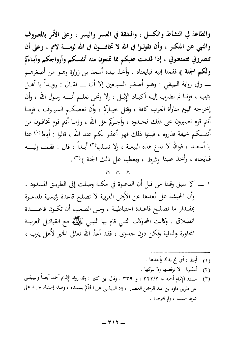 والطاعة في النشاط والكسل، والنفقة في العسر واليسر، وعلى الأمر بالمعروف والنهي عن المنكر، وأن تقولوا في الله لا تخافون في الله لومة لائم، وعلى أن تنصروني فتمنعوني، إذا قدمت عليكم مما تمنعون منه أنفسكم وأزواجكم وأبناءكم ولكم الجنة)) فقمنا إليه فبايعناه. وأخذ بيده أسعد بن زرارة وهو من أصغرهم - وفي رواية البيهقي: وهو أصغر السبعين إلا أنا - فقال: رويدا يا أهل يثرب، فإنا لم نضرب إليه أكباد الإبل، إلا ونحن نعلم أنه رسول الله، وأن إخراجه اليوم مناوأة العرب كافة، وقتل خياركم، وأن تعضكم السيوف، فإما أنتم قوم تصبرون على ذلك فخذوه، وأجركم على الله، وإما أنتم قوم تخافون من أنفسكم خيفة فذروه، فبينوا ذلك فهو أعذر لكم عند الله، قالوا: أمط (¬1) عنا يا أسعد، فوالله لا ندع هذه البيعة، ولا نسلبها (¬2) أبدا، قال: فقمنا إليه فبايعناه، وأخذ علينا وشرط، ويعطينا على ذلك الجنة) (¬3).
