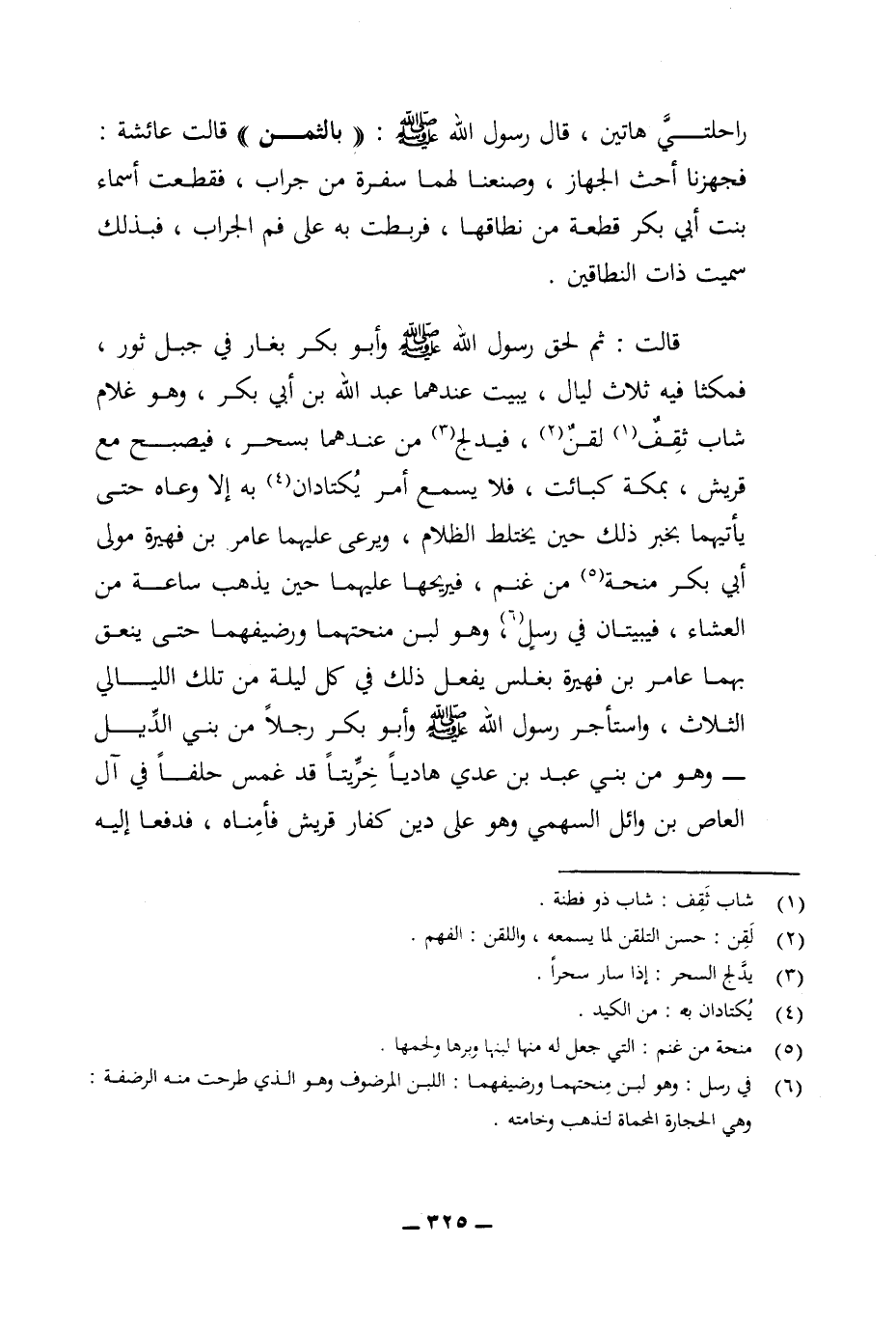 قالت: ثم لحق رسول الله (ص) وأبو بكر بغار في جبل ثور، فمكثا فيه ثلاث ليال، يبيت عندهما عبد الله بن أبي بكر، وهو غلام شاب ثقف (¬1) لقن (¬2)، فيدلج (¬3) من عندهما بسحر، فيصبح مع قريش، بمكة كبائت، فلا يسمع أمر يكتادان (¬4) به إلا وعاه حتى يأتيهما بخبر ذلك حين يختلط الظلام، ويرعى عليهما عامر بن فهيرة مولى أبي بكر منحة (¬5) من غنم، فيريحها عليهما حين يذهب ساعة من العشاء، فيبيتان في رسل (¬6)، وهو لبن منحتهما ورضيفهما حتى ينعق بهما عامر بن فهيرة بغلس يفعل ذلك في كل ليلة من تلك الليالي الثلاث، واستأجر رسول الله (ص) وأبو بكر رجلا من بني الديل - وهو من بني عبد بن عدي هاديا خريتا قد غمس حلفا في آل العاص بن وائل السهمي وهو على دين كفار قريش فأمناه، فدفعا إليه