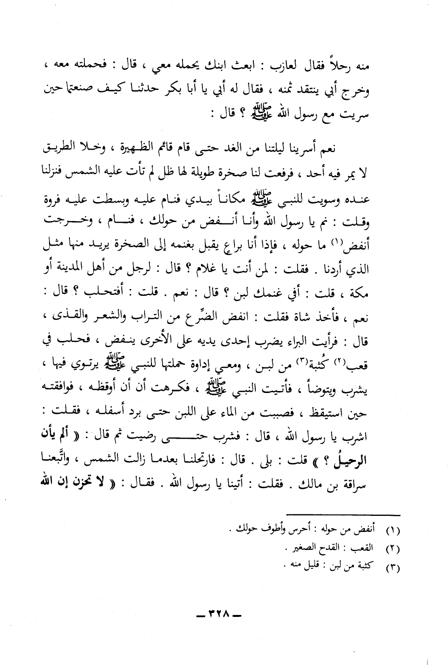 اشرب يا رسول الله، قال: فشرب حتى رضيت ثم قال: ((ألم يأن الرجل؟)) قلت: بلى. قال: فارتحلنا بعدما زالت الشمس، واتبعنا سراقة بن مالك. فقلت: أتينا يا رسول الله (ص) فقال: ((لا تحزن إن الله