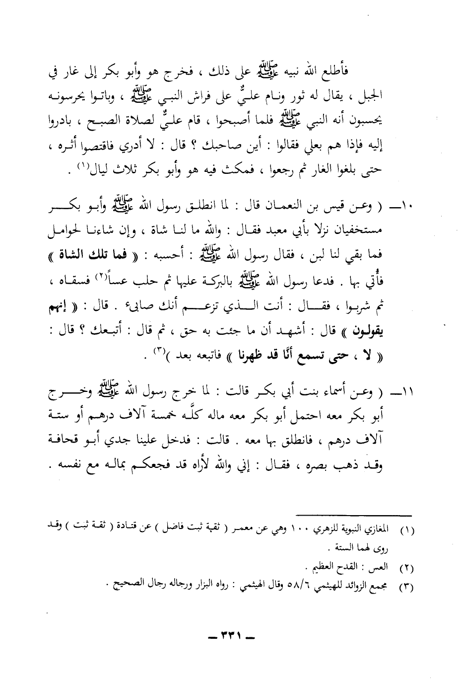 11 - (وعن أسماء بنت أبي بكر قالت: لما خرج رسول الله (ص) وخرج أبو بكر معه احتمل أبو بكر معه ماله كله خمسة آلاف درهم أو ستة آلاف درهم، فانطلق بها معه. قالت: فدخل علينا جدي أبو قحافة وقد ذهب بصره، فقال: إني والله لأراه قد فجعكم بماله مع نفسه.