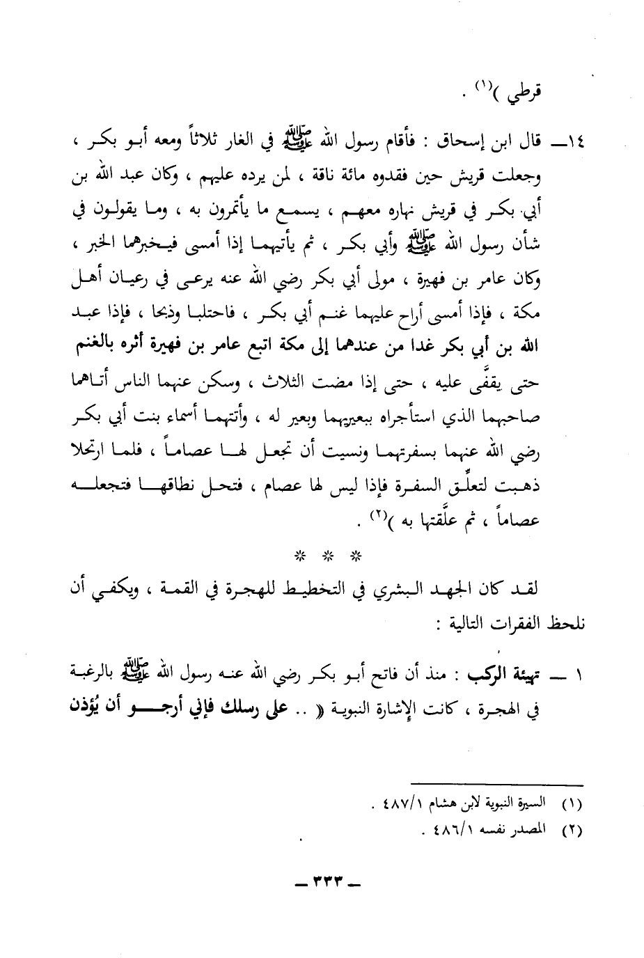 14 - قال ابن إسحاق: فأقام رسول الله (ص) في الغار ثلاثا ومعه أبو بكر، وجعلت قريش حين فقدوه مائة ناقة، لمن يرده عليهم، وكان عبد الله بن أبي بكر في قريش نهاره معهم، يسمع ما يأتمرون به، وما يقولون في شأن رسول الله (ص) وأبي بكر، ثم يأتيهما إذا أمسى فيخبرهما الخبر، وكان عامر بن فهيرة، مولى أبي بكر رضي الله عنه يرعى في رعيان أهل مكة، فإذا أمسى أراح عليهما غنم أبي بكر، فاحتلبا وذبحا، فإذا عبد الله بن أبي بكر غدا من عندهما إلى مكة اتبع عامر بن فهيرة أثره بالغنم حتى يقفى عليه، حتى إذا مضت الثلاث، وسكن عنهما الناس أتاهما صاحبهما الذي استأجراه ببعيرهما وبعير له، وأتتهما أسماء بنت أبي بكر رضي الله عنهما بسفرتهما ونسيت أن تجعل لها عصاما، فلما ارتحلا ذهجت لتعلق السفرة فإذا ليس لها عصام، فتحل نطاقها فتجعله عصاما، ثم علقتها به) (¬2).