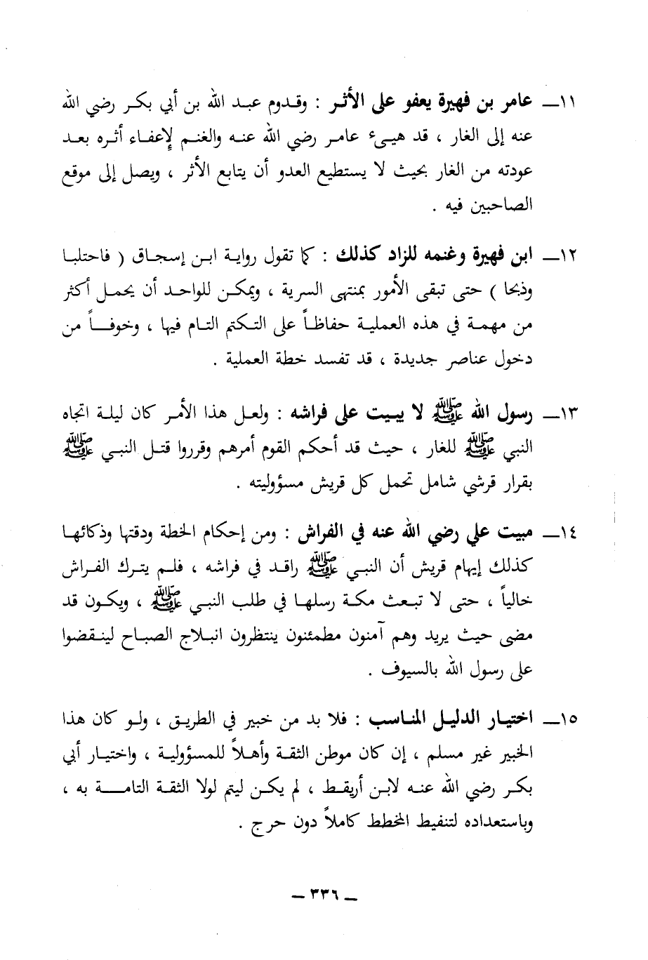 14 - مبيت علي رضي الله عنه في الفراش: ومن إحكام الخطة ودقتها وذكائها كذلك إيهام قريش أن النبي (ص) راقد في فراشه، فلم يترك الفراش خاليا، حتى لا تبعث مكة رسلها في طلب النبي (ص)، ويكون قد مضى حيث يريد وهم آمنون مطمئنون ينتظرون انبلاج الصباح لينقضوا على رسول الله بالسيوف.