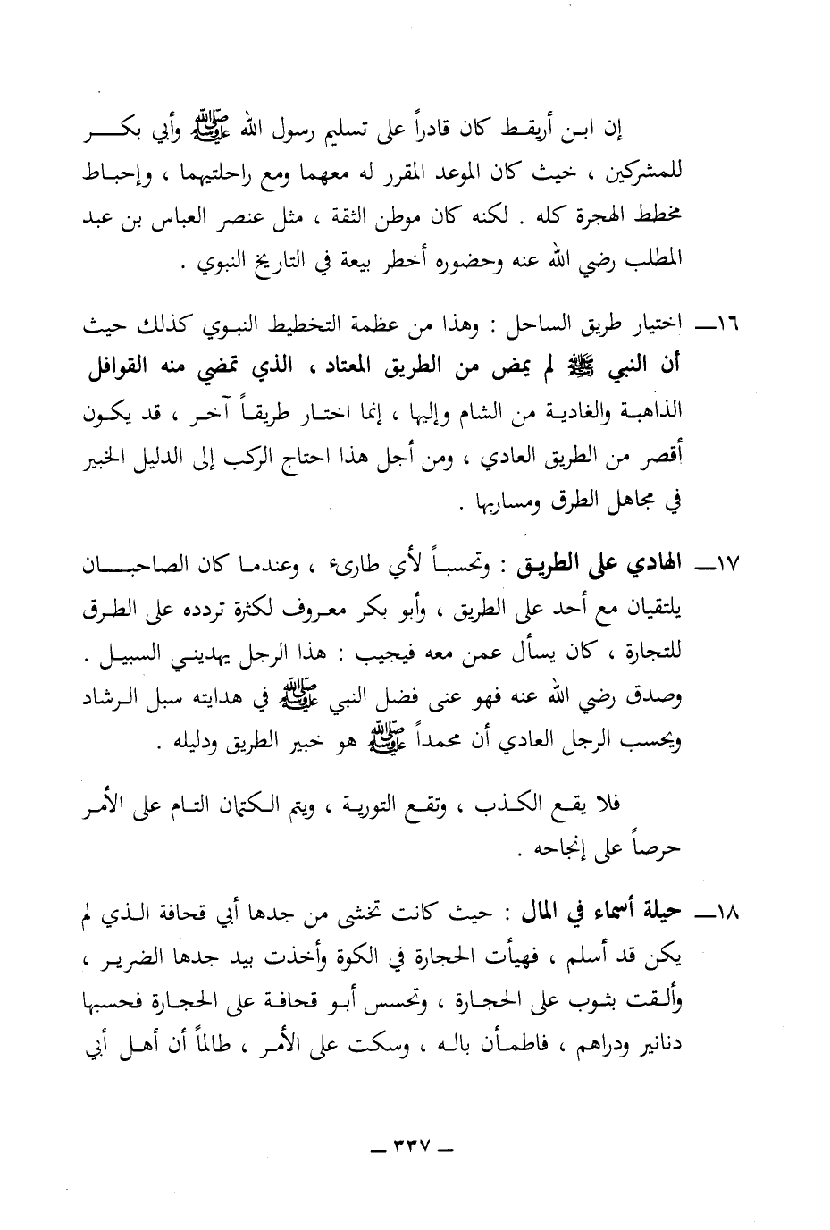 16 - اختيار طريق الساحل: وهذا من عظمة التخطيط النبوي كذلك حيث أن النبي (ص) لم يمض من الطريق المعتاد، الذي تمضي منه القوافل الذاهبة والغادية من الشام وإليها، إنما اختار طريقا آخر، قد يكون أقصر من الطريق العادي، ومن أجل هذا احتاج الركب إلى الدليل الخبير في مجاهل الطرق ومساربها.