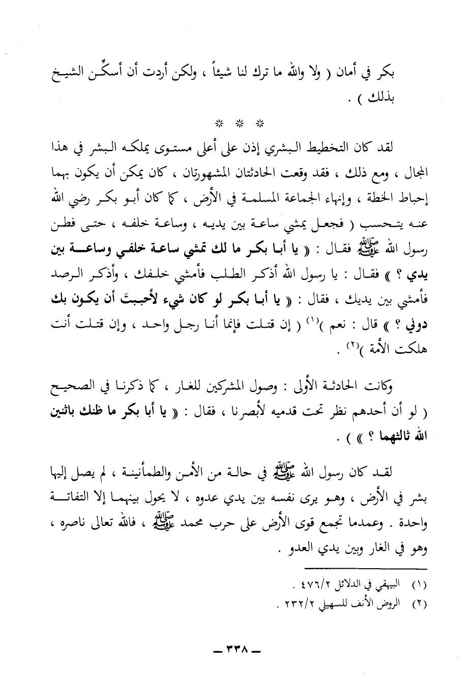 لقد كان التخطيط البشري إذن على أعلى مستوى يملكه البشر في هذا المجال، ومع ذلك، فقد وقعت الحادثتان المشهورتان، كان يمكن أن يكون بهما إحباط الخطة، وإنهاء الجماعة المسلمة في الأرض، كما كان أبو بكر رضي الله عنه يتحسب (فجعل يمشي ساعة بين يديه، وساعة خلفه، حتى فطن رسول الله (ص) فقال: ((يا أبا بكر ما لك تمشي ساعة خلفي وساعة بين يدي؟)) فقال: يا رسول الله أذكر الطلب فأمشي خلفك، وأذكر الرصد فأمشي بين يديك، فقال: ((يا أبا بكر لو كان شيء لأحببت أن يكون بك دوني؟)) قال: نعم) (¬1) (إن قتلت فإنما أنا رجل واحد، وإن قتلت أنت هلكت الأمة) (¬2).