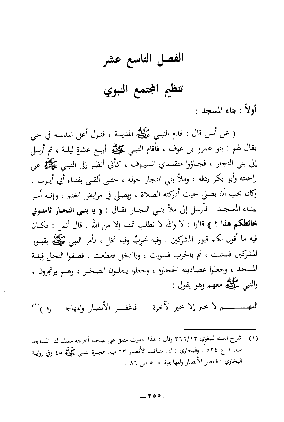 (¬1) شرح السنة للبغوي 366/ 13 وقال: هذا حديث متفق على صحته أخرجه مسلم ك. المساجد ب. 1 ح 524. والبخاري: ك. مناقب الأنصار 63 ب. هجرة النبي (ص) 45 وفي رواية البخاري: فانصر الأنصار والمهاجرة ج 5 ص 86.