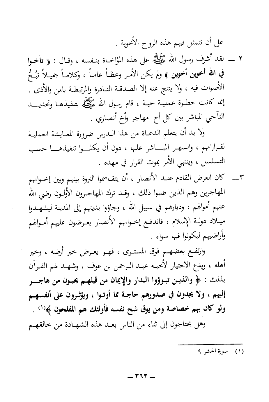 وارتفع بعضهم فوق المستوى، فهو يعرض خير أرضه، وخير أهله، ويدع الاختيار لأخيه عبد الرحمن بن عوف، وشهد لهم القرآن بذلك: {والذين تبوؤوا الدار والإيمان من قبلهم يحبون من هاجر إليهم ولا يجدون في صدورهم حاجة مما أوتوا ويؤثرون على أنسفهم ولو كان بهم خصاصة ومن يوق شح نفسه فأولئك هم المفلحون} (¬1).