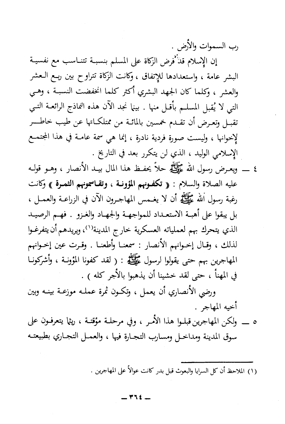 إن الإسلام قد فرض الزكاة على المسلم بنسبة تتناسب مع نفسية البشر عامة، واستعدادها للإتفاق، وكانت الزكاة تتراوح بين ربع العشر والعشر، وكلما كان الجهد البشري أكثر كلما انخفضت النسبة، وهي التي لا يقبل المسلم بأقل منها. بينما نجد الآن هذه النماذج الرائعة التي تقبل وتعرض أن تقدم خمسين بالمائة من ممتلكاتها عن طيب خاطر لإخوتنها، وليست صوره فردية نادرة، إنما هي سمة عامة في هذا المجتمع الإسلامي الوليد، الذي لن يتكرر بعد في التاريخ.