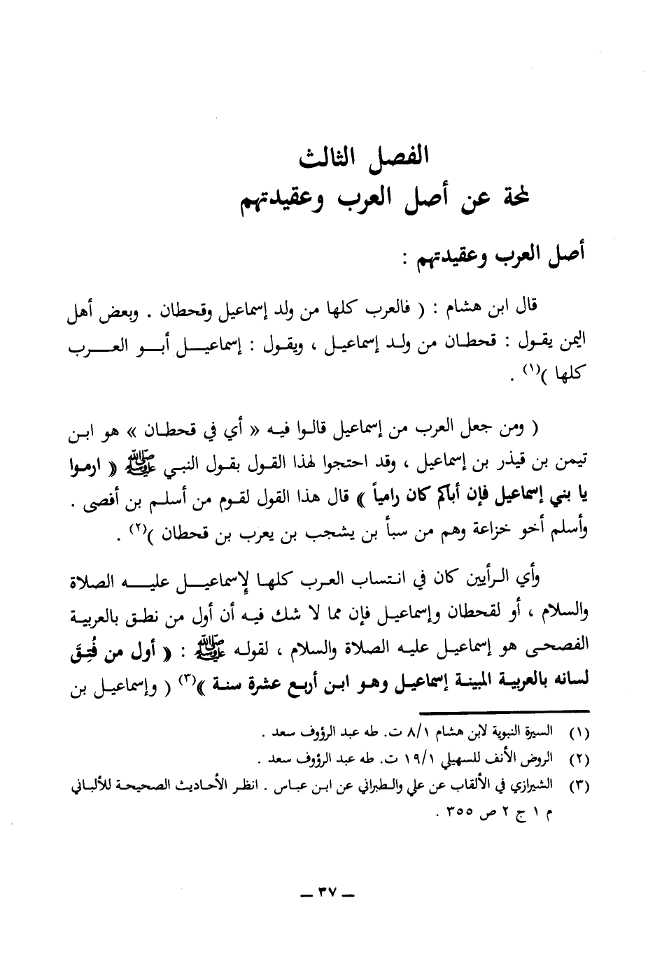 وأي الرأيين كان في انتساب العرب كلها لإسماعيل عليه الصلاة والسلام، أو لقحطان وإسماعيل فإن مما لا شك فيه أن أول من نطق بالعربية الفصحى هو إسماعيل عليه الصلاة والسلام، لقوله - صلى الله عليه وسلم -: «أول من فتق لسانه بالعربية المبينة إسماعيل وهو ابن أربع عشرة سنة» (¬3) (وإسماعيل بن